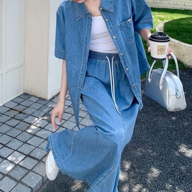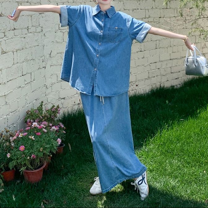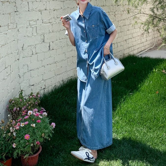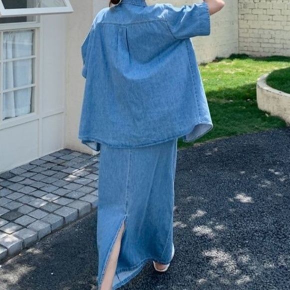 オーバーサイズのシャツとスリット入りスカートで快適な着心地とリラックス感を演出