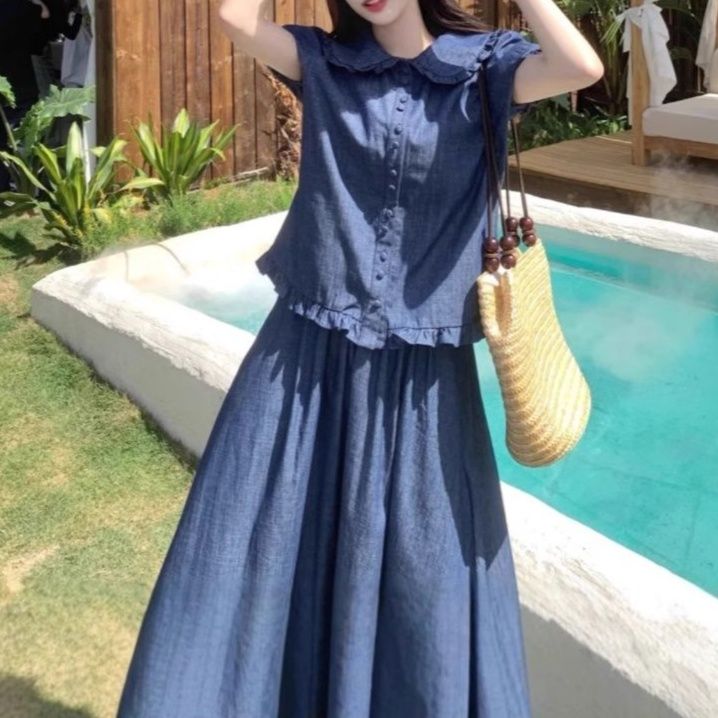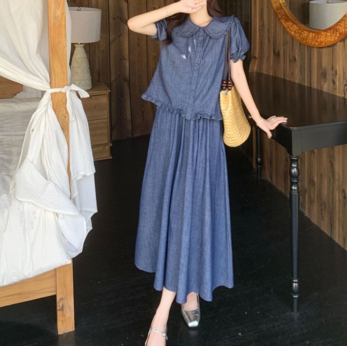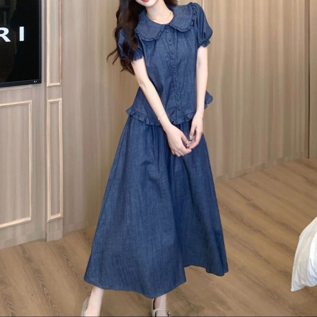 涼やかな丸襟が特徴のトップスとロングスカートのデニムセットアップ。