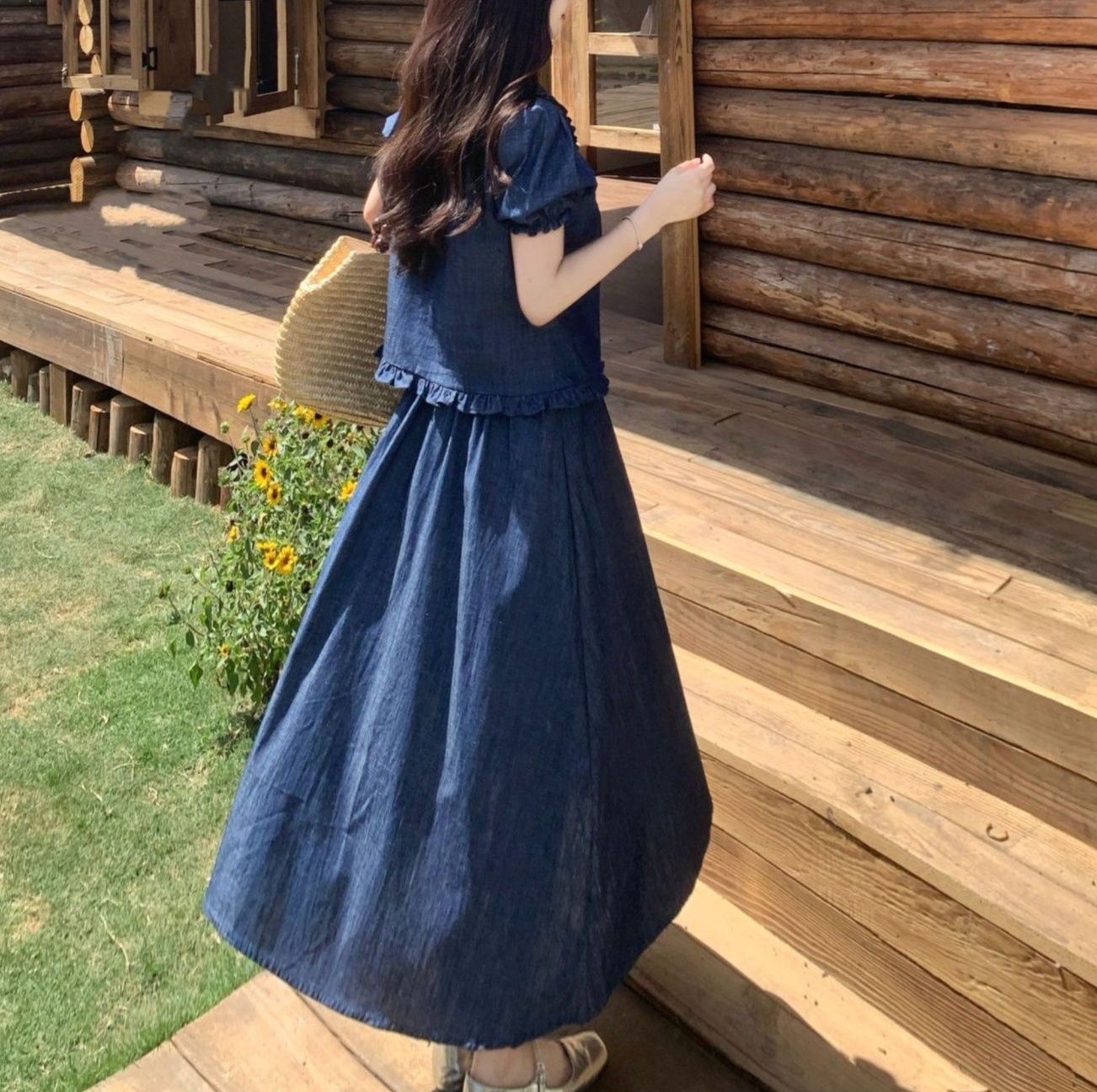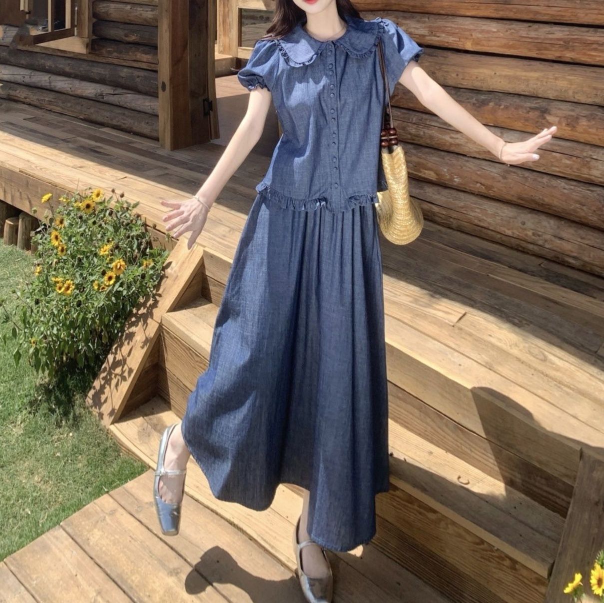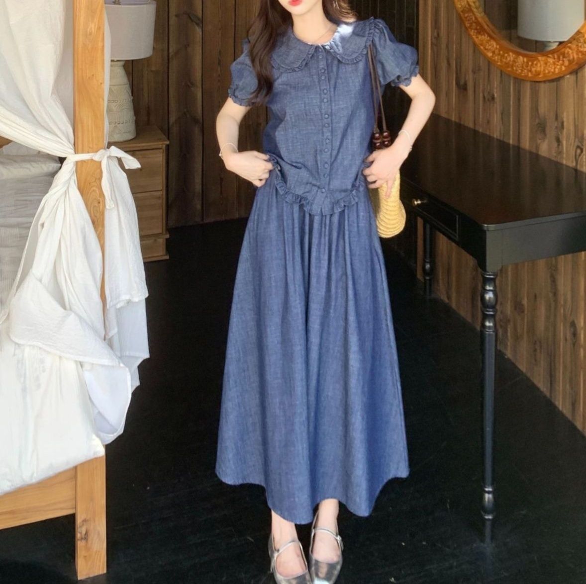 涼やかな丸襟が特徴のトップスとロングスカートのデニムセットアップ。