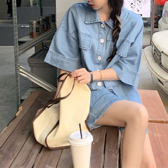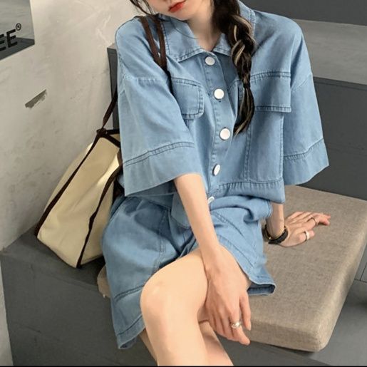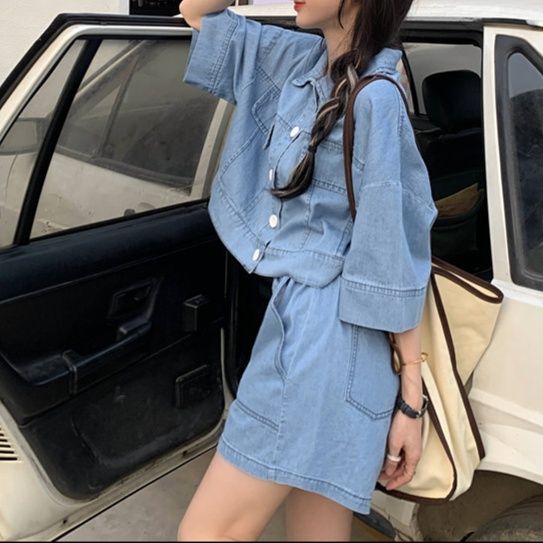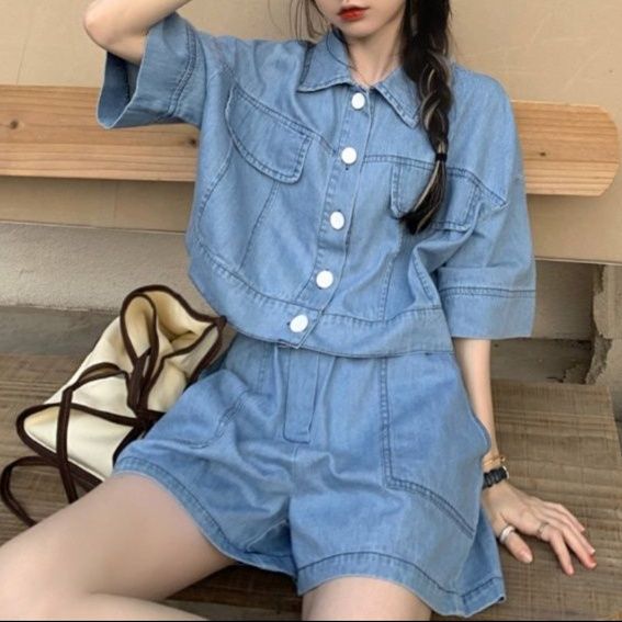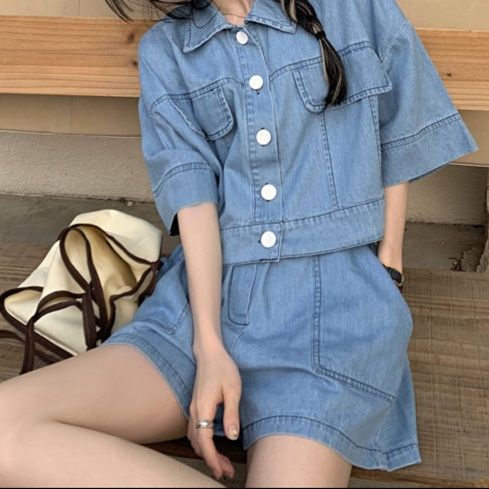 五分袖のショートジャケットとショートパンツを組み合わせたデニムセットアップで、夏のお出かけスタイルにぴったり。