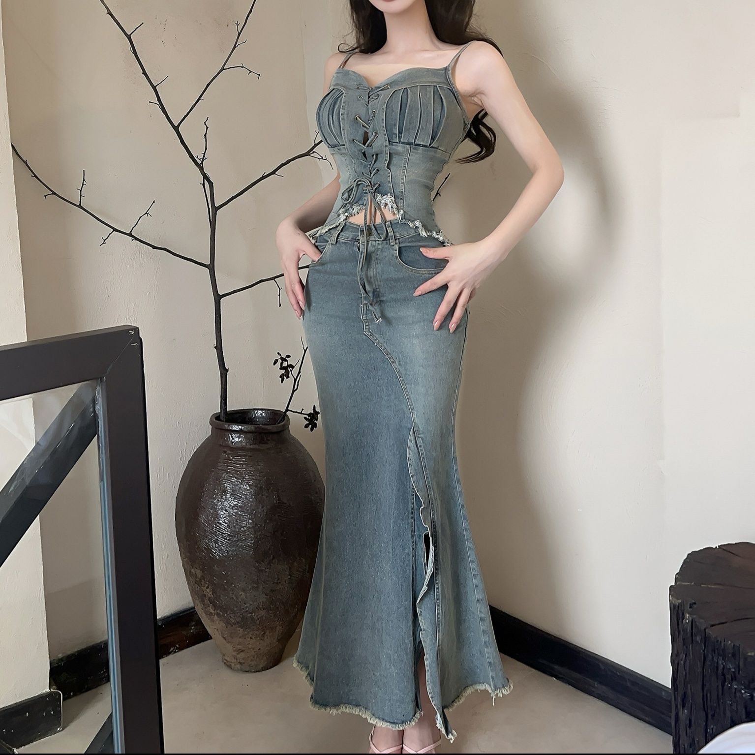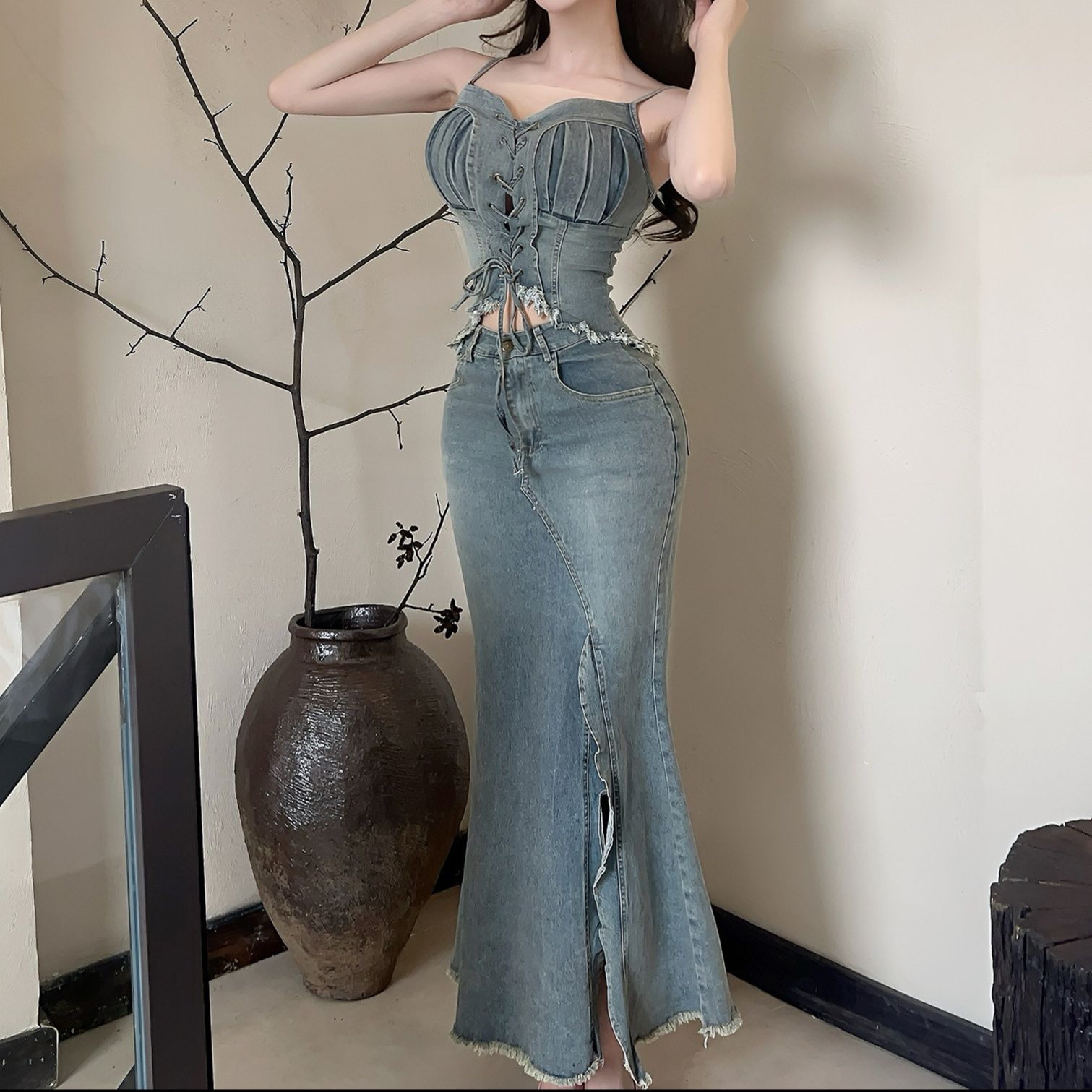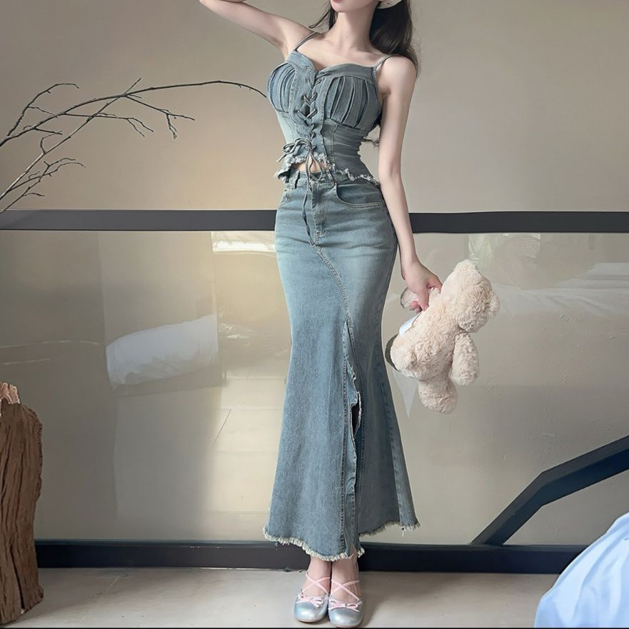 華やかなギャザーとレースアップデザインが目を引くデニムセットアップ。