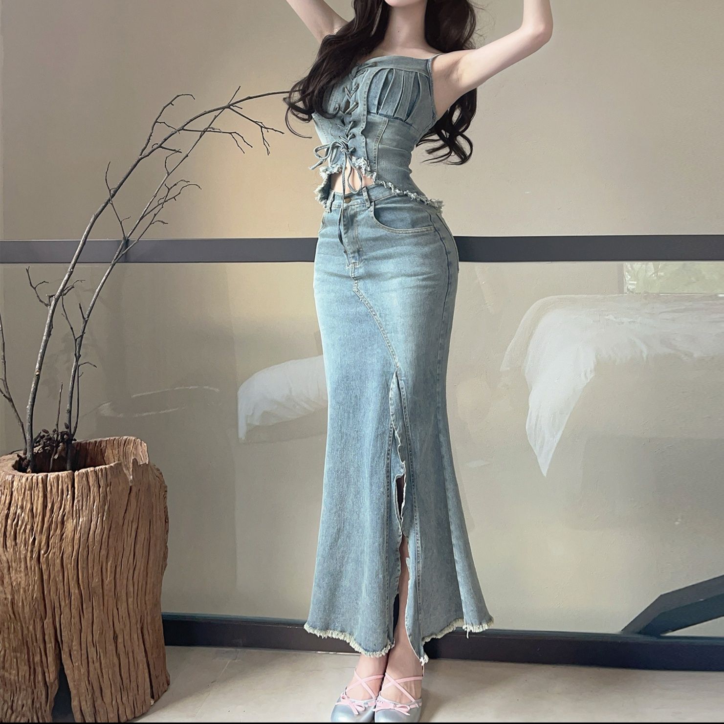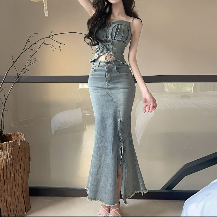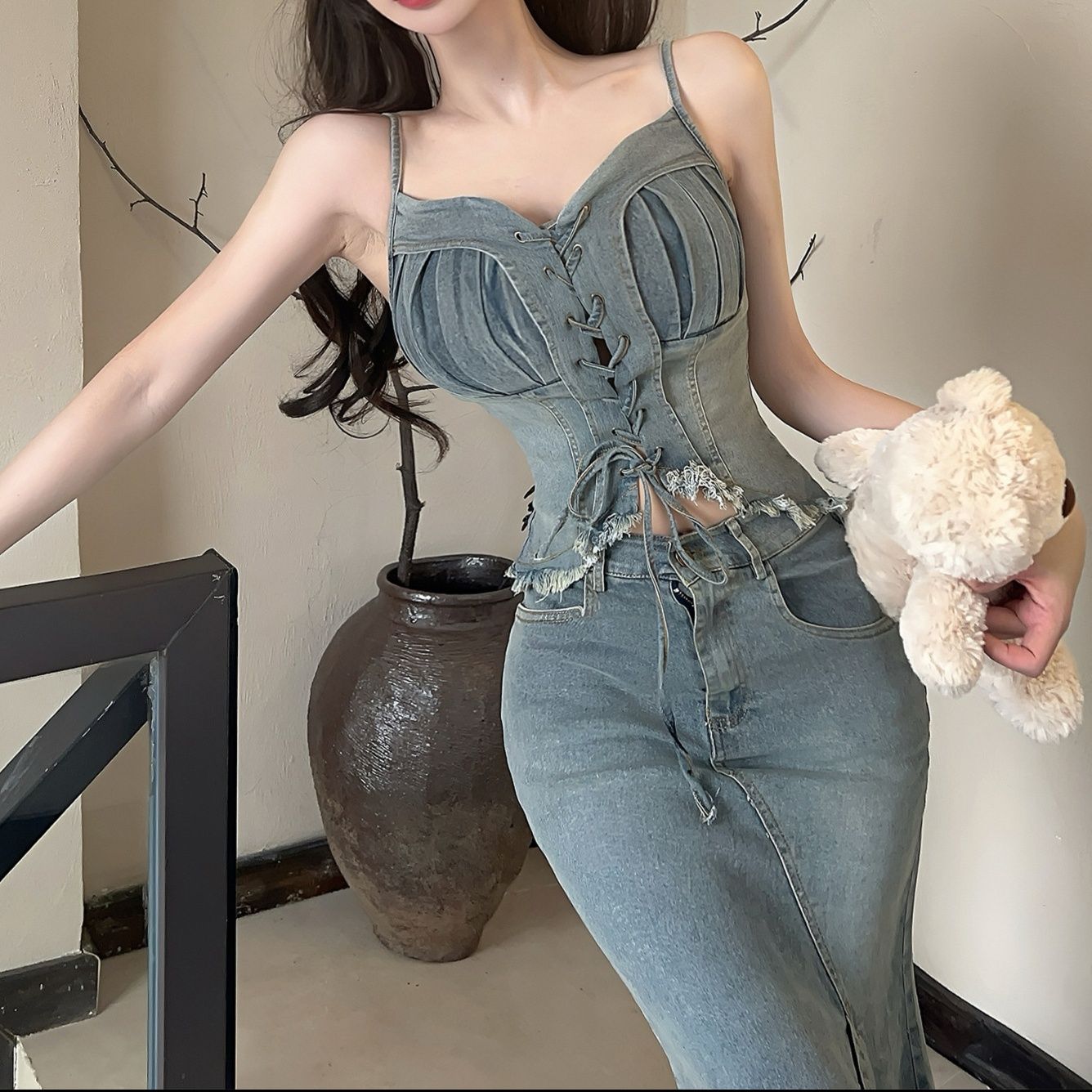 華やかなギャザーとレースアップデザインが目を引くデニムセットアップ。