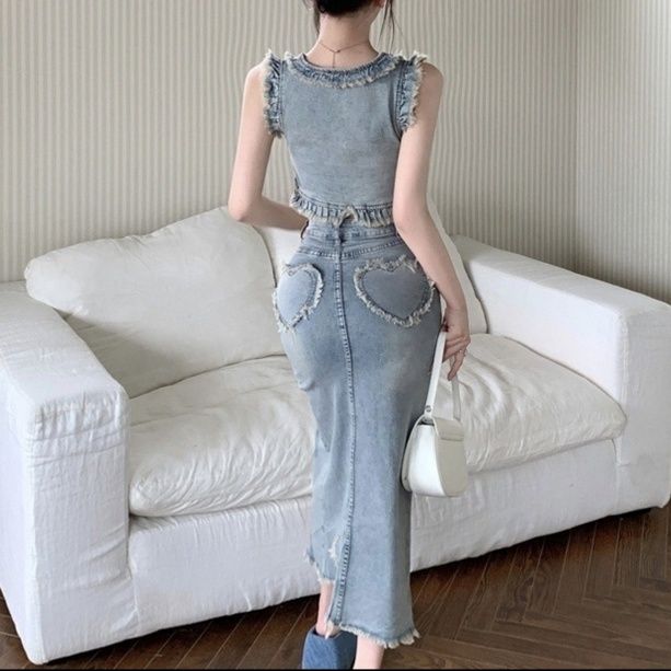 トップスの裾と襟元にはほつれ加工を施し、スカートのバックポケットにはハート型のダメージデザインが特徴的です。