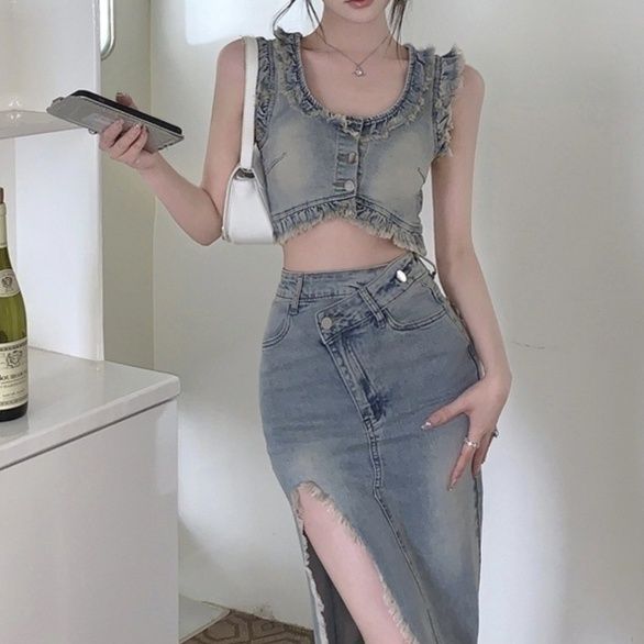 ショート丈のノースリーブトップスと、サイドスリット入りのロングスカートの組み合わせがスタイリッシュな印象を演出します。