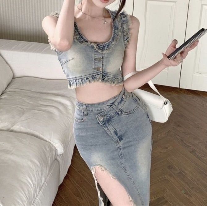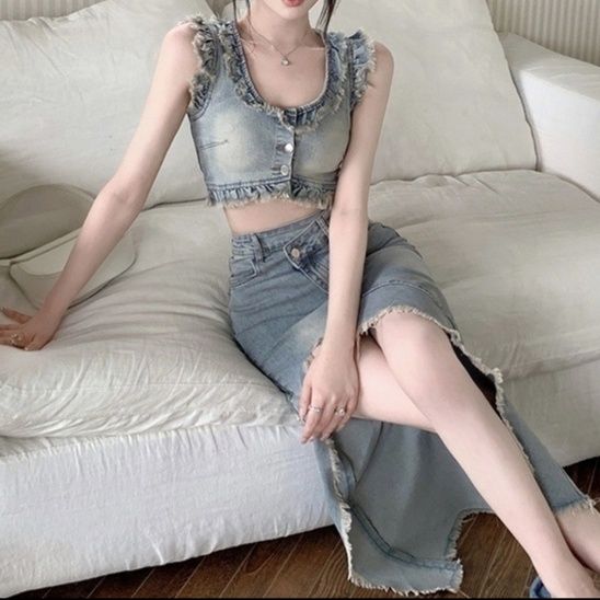 フリンジとダメージ加工が施されたデニムセットアップです。