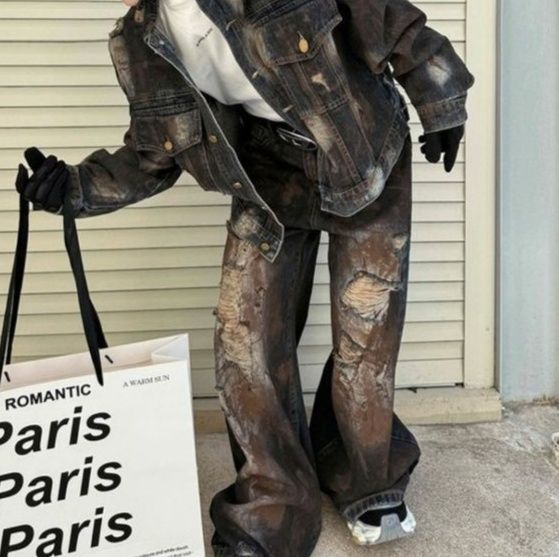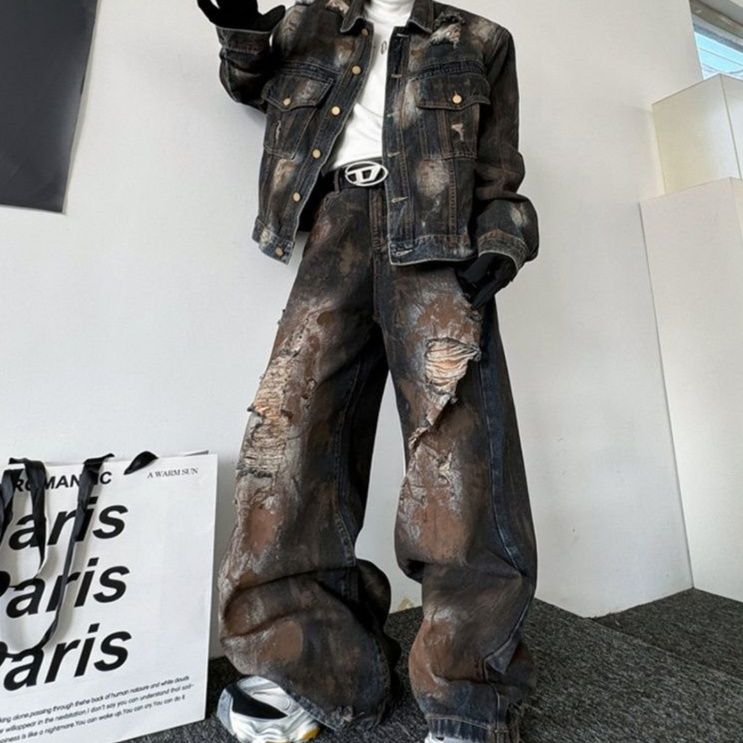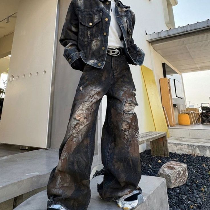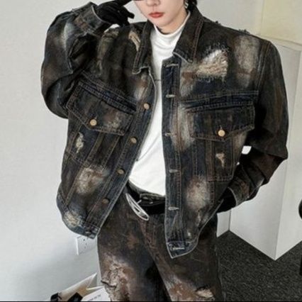 随所に施された大胆なダメージ加工が独特の雰囲気を演出し、存在感のある仕上がりに