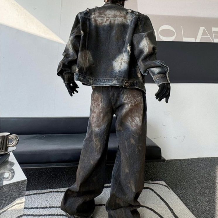 各所に施されたダメージ加工が存在感のあるデニムセットアップ。