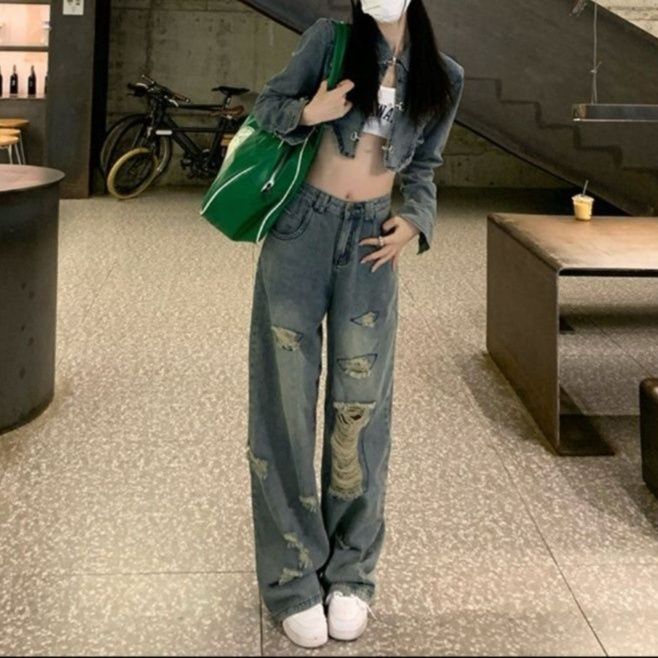 クロップド丈のジャケットとゆったりとしたワイドシルエットのパンツが特徴で、こなれ感のあるスタイリングを演出します。