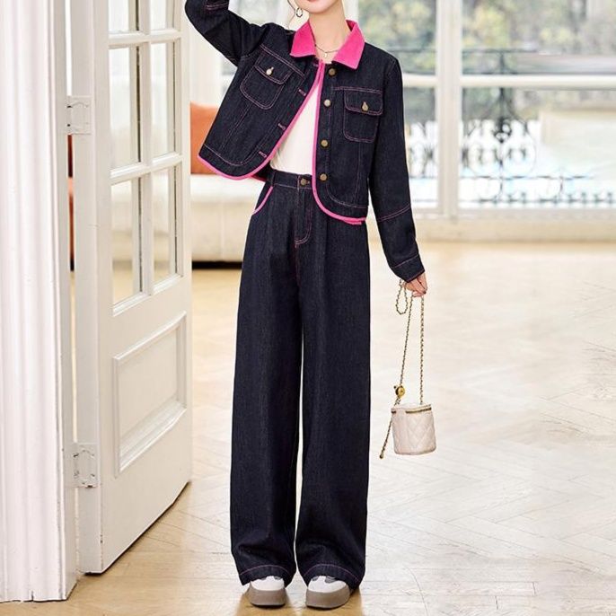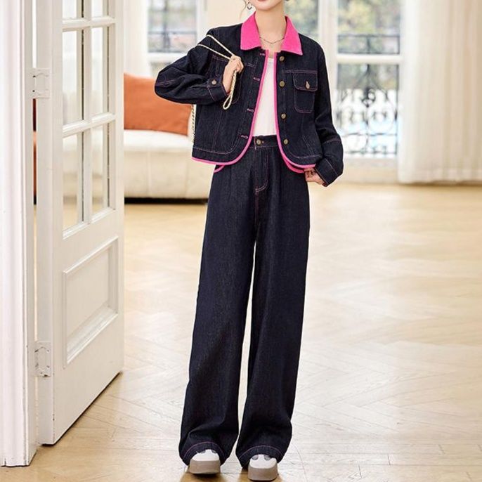 襟元や縁取りのピンクが、デニムの重厚感を和らげ、女性らしい華やかさを演出
