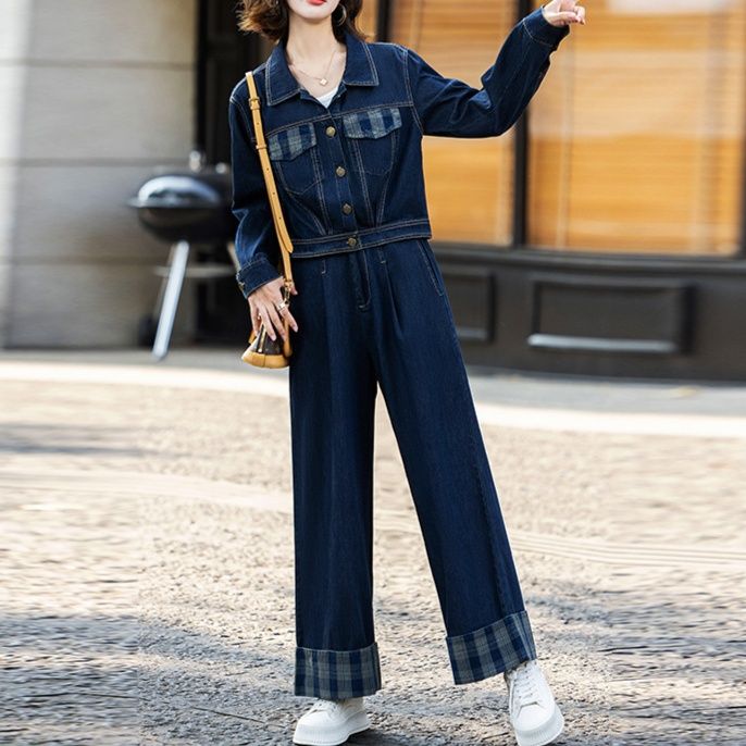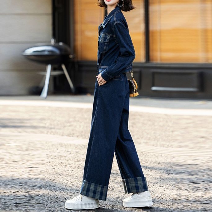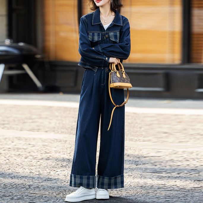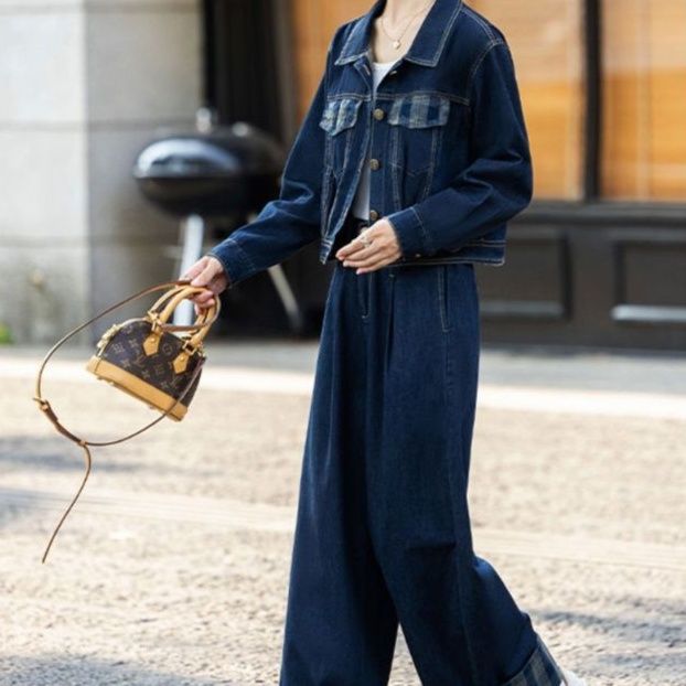 上品で個性的なデニムセットアップは、ジャケットとワイドパンツの組み合わせが魅力的です。