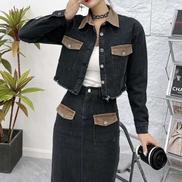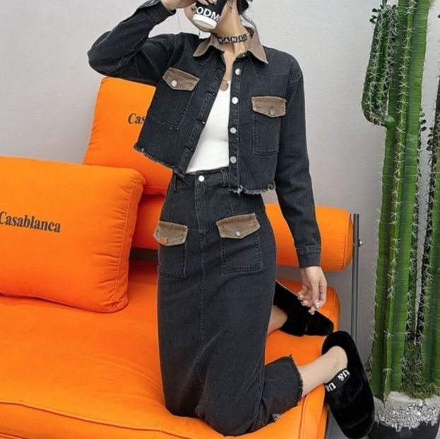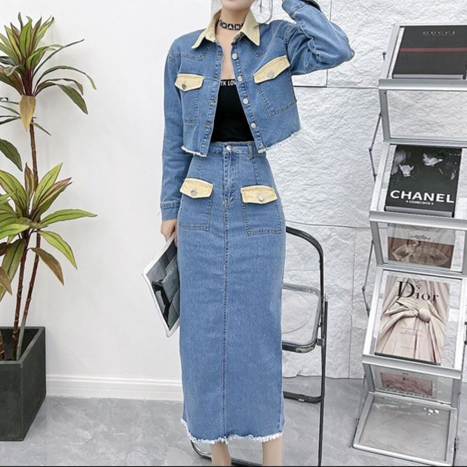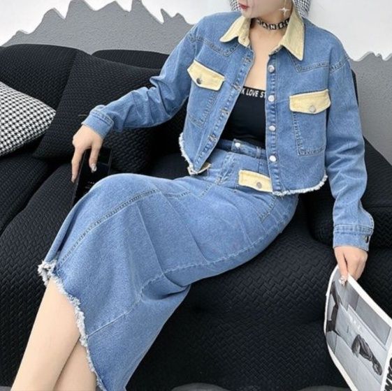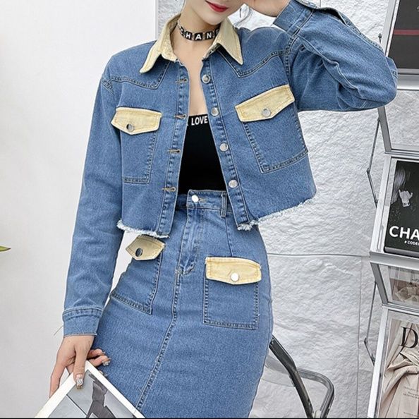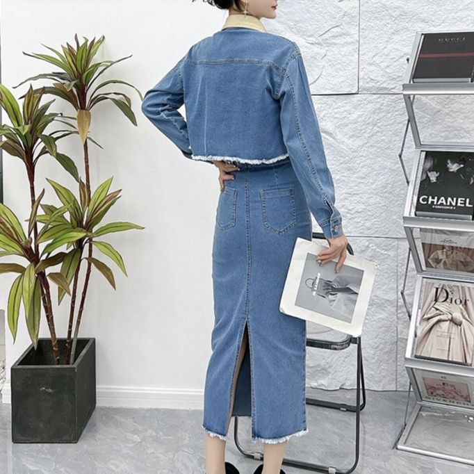 ショート丈のジャケットとミディ丈のタイトスカートがセットになった、トレンド感のあるジージャンセットアップ。