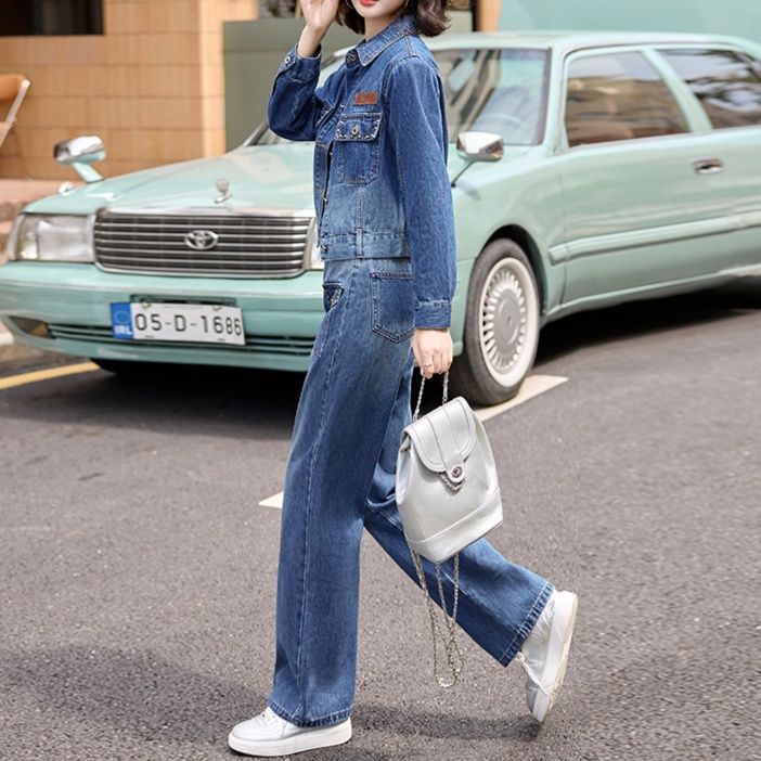 ジャケットはクラシックな襟付きデザインで、パンツはゆったりとしたストレートシルエットが特徴です。