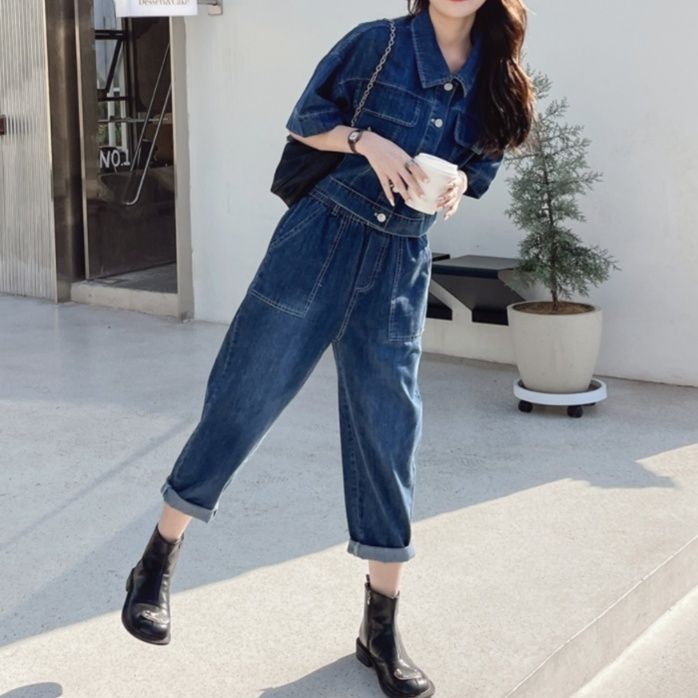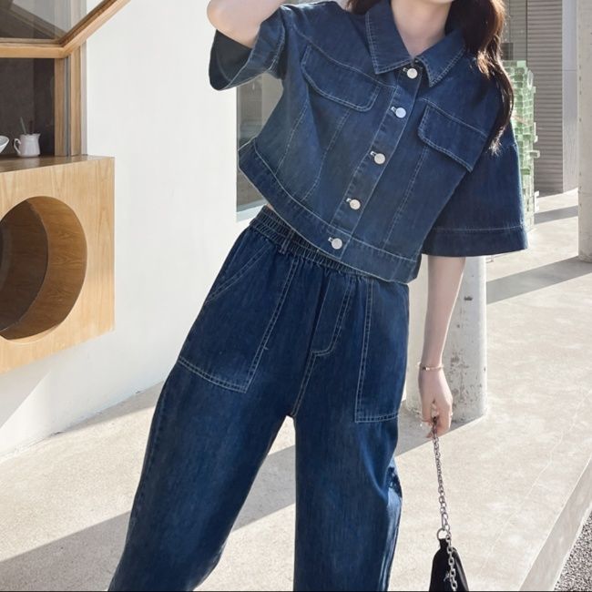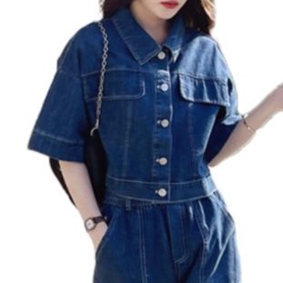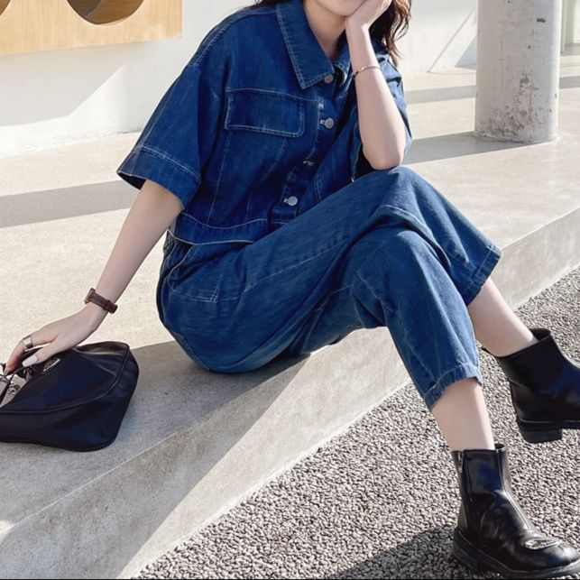 半袖のショート丈デニムジャケットとゆったりとしたワイドシルエットのクロップドパンツを組み合わせたデニムセットアップです。