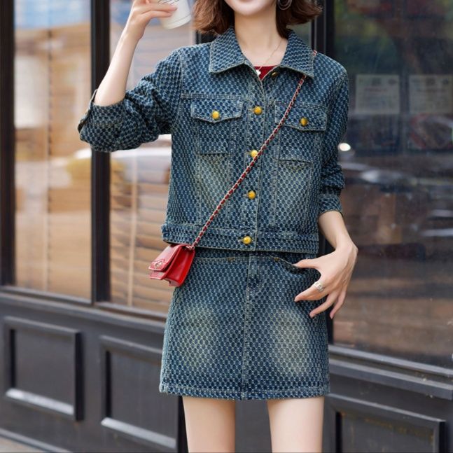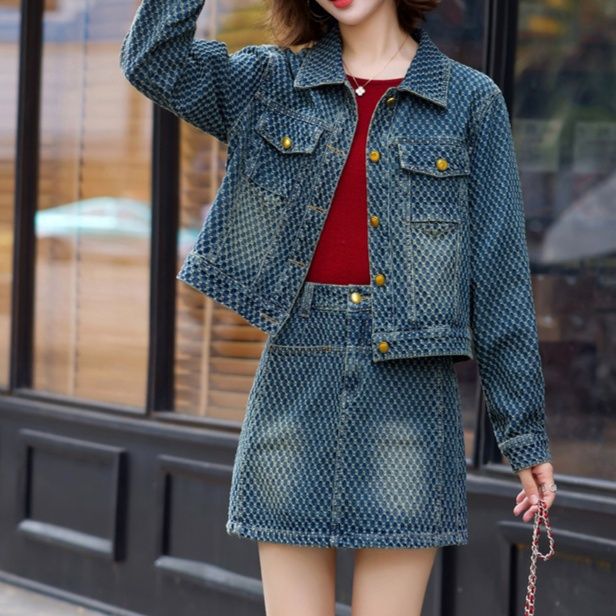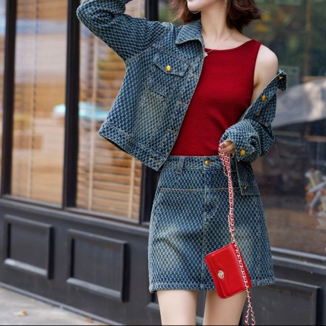 上品なツイード風の柄が印象的なデニムセットアップです。