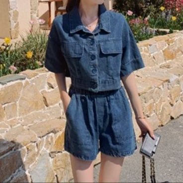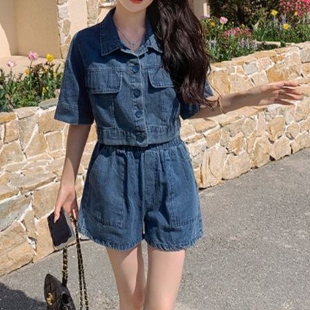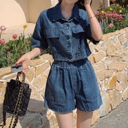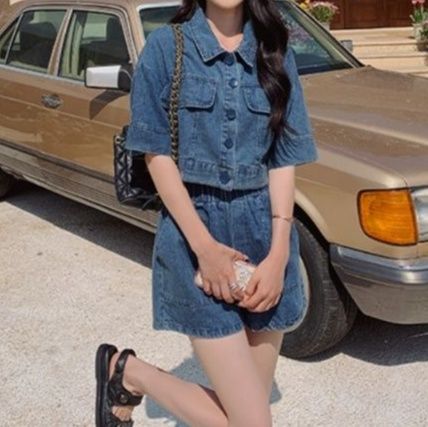 五分袖のショート丈ジャケットとショートパンツを合わせたジージャンセットアップで、こなれ感のある着こなしが楽しめます。