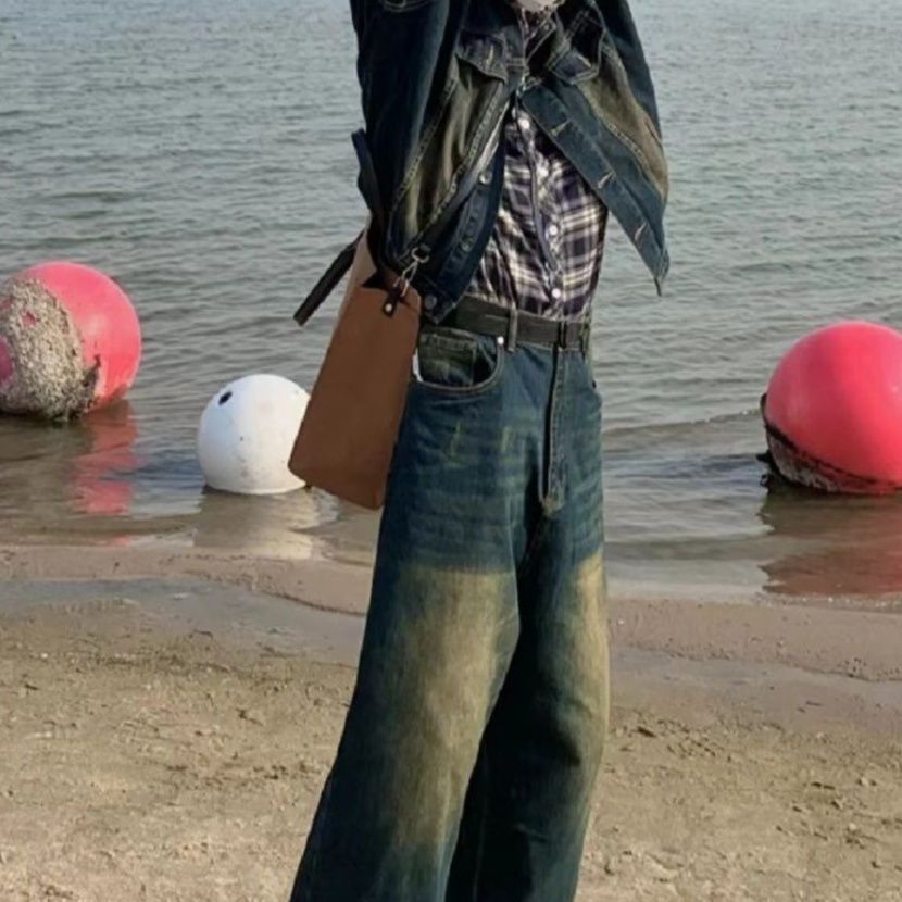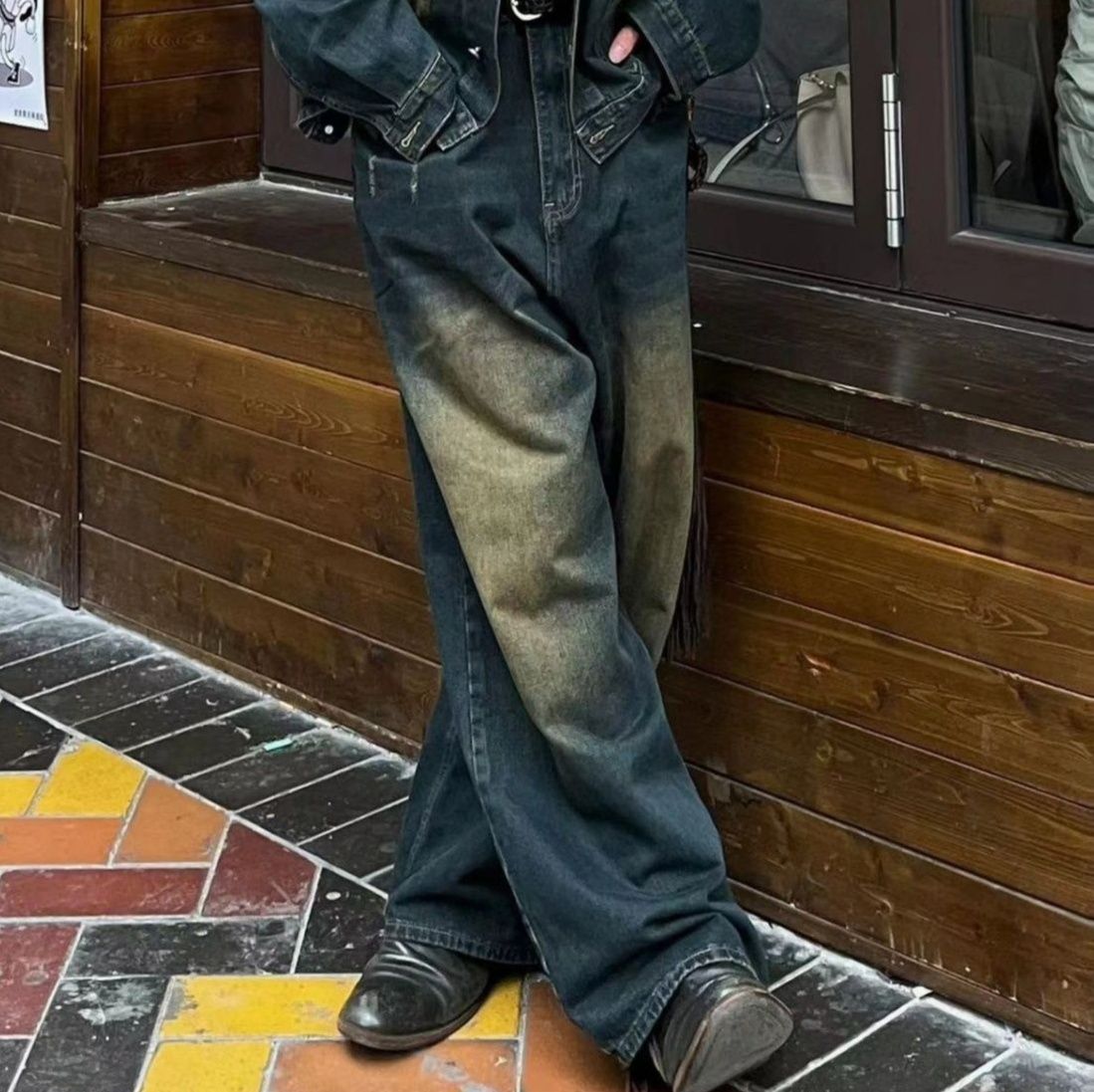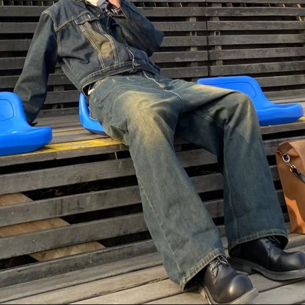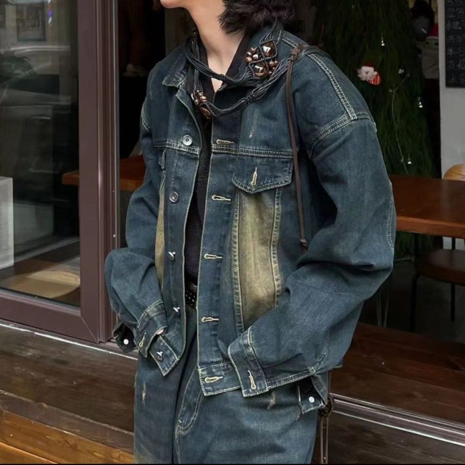 ジャケットはユーズド加工が施された味わい深いデザインで、ワイドなパンツとの組み合わせがこなれた雰囲気を演出します。