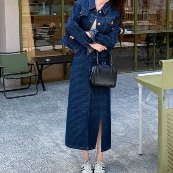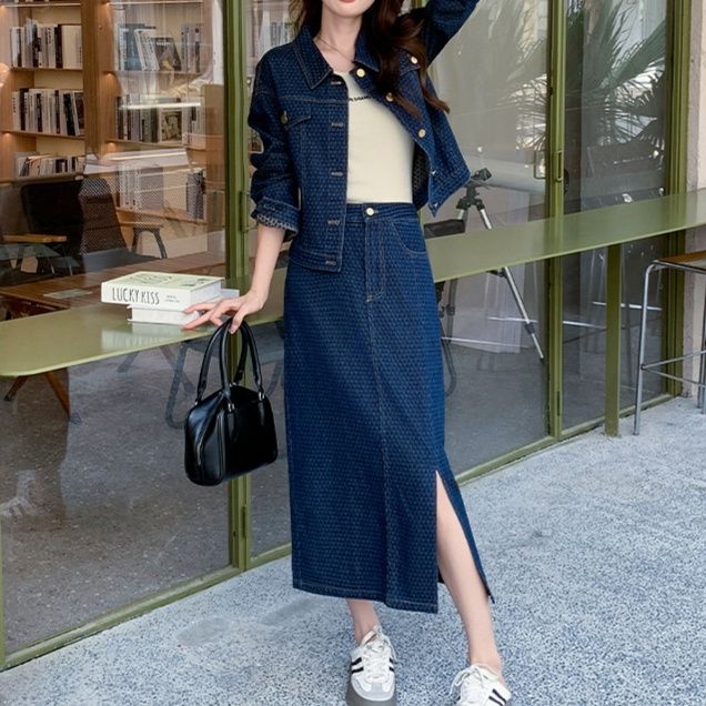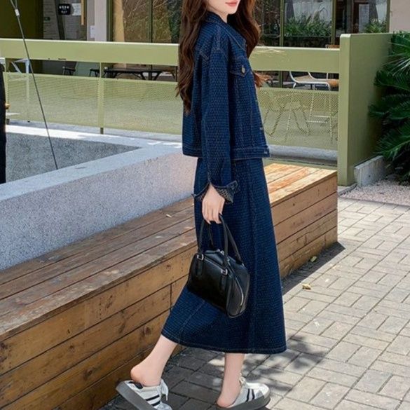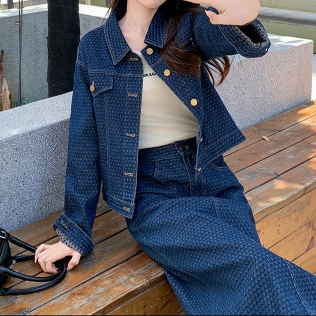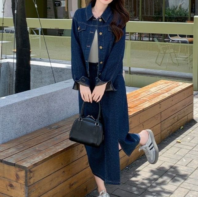 全体に施された上品な柄が印象的なデニムセットアップです。