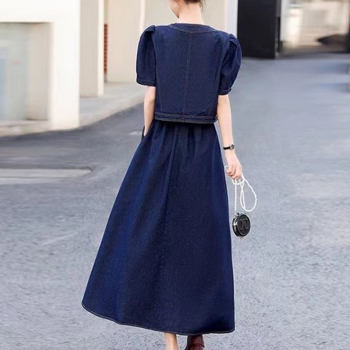 トレンド感のあるパフスリーブが印象的な短丈ジャケットとロング丈スカートの上品な組み合わせです。