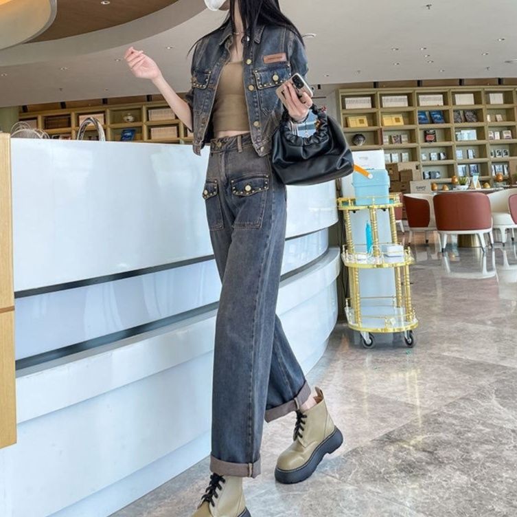 トレンド感溢れるデニムセットアップが登場しました。ショート丈のジャケットとゆったりとしたストレートシルエットのワイドパンツを組み合わせた、洗練されたジージャンセットアップです。