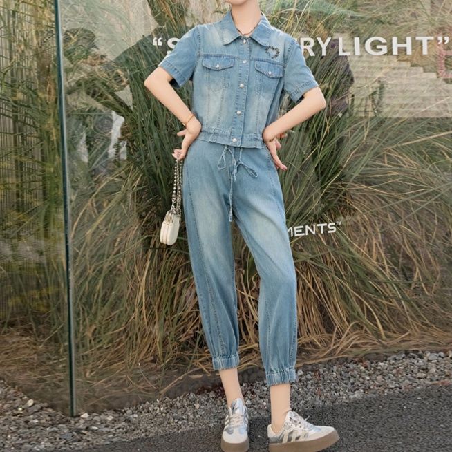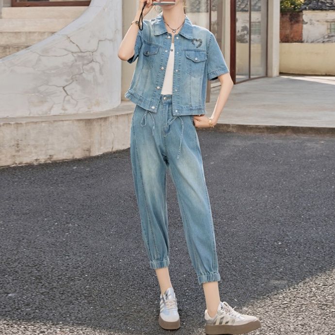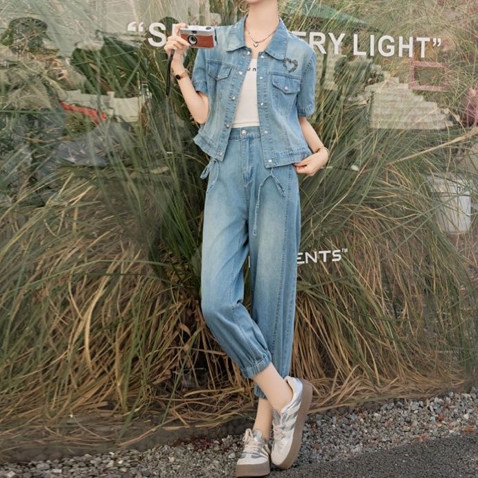 カジュアルスタイルを格上げするデニムセットアップの登場です。半袖のジャケットは程よい着丈で、クロップドパンツとの相性が抜群。