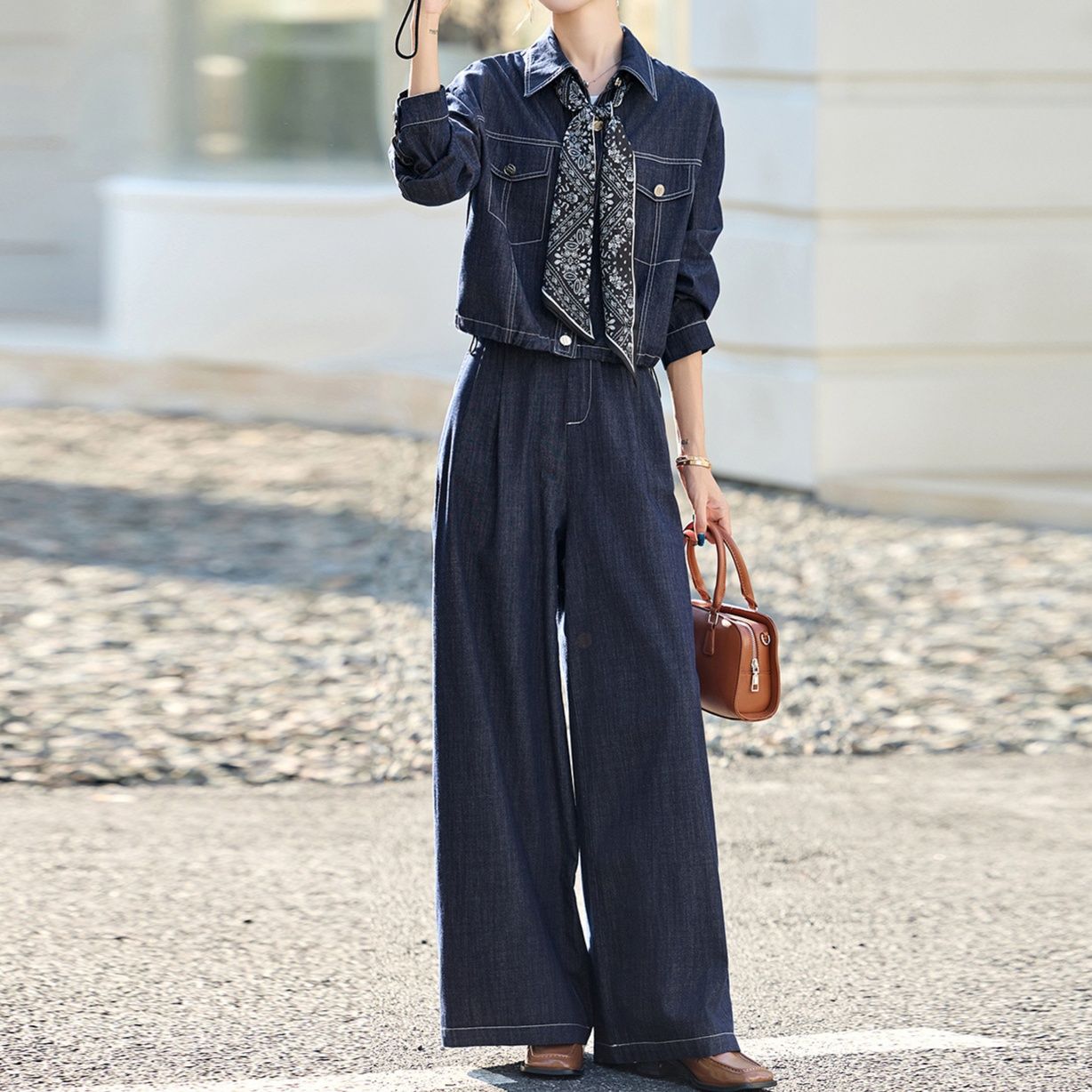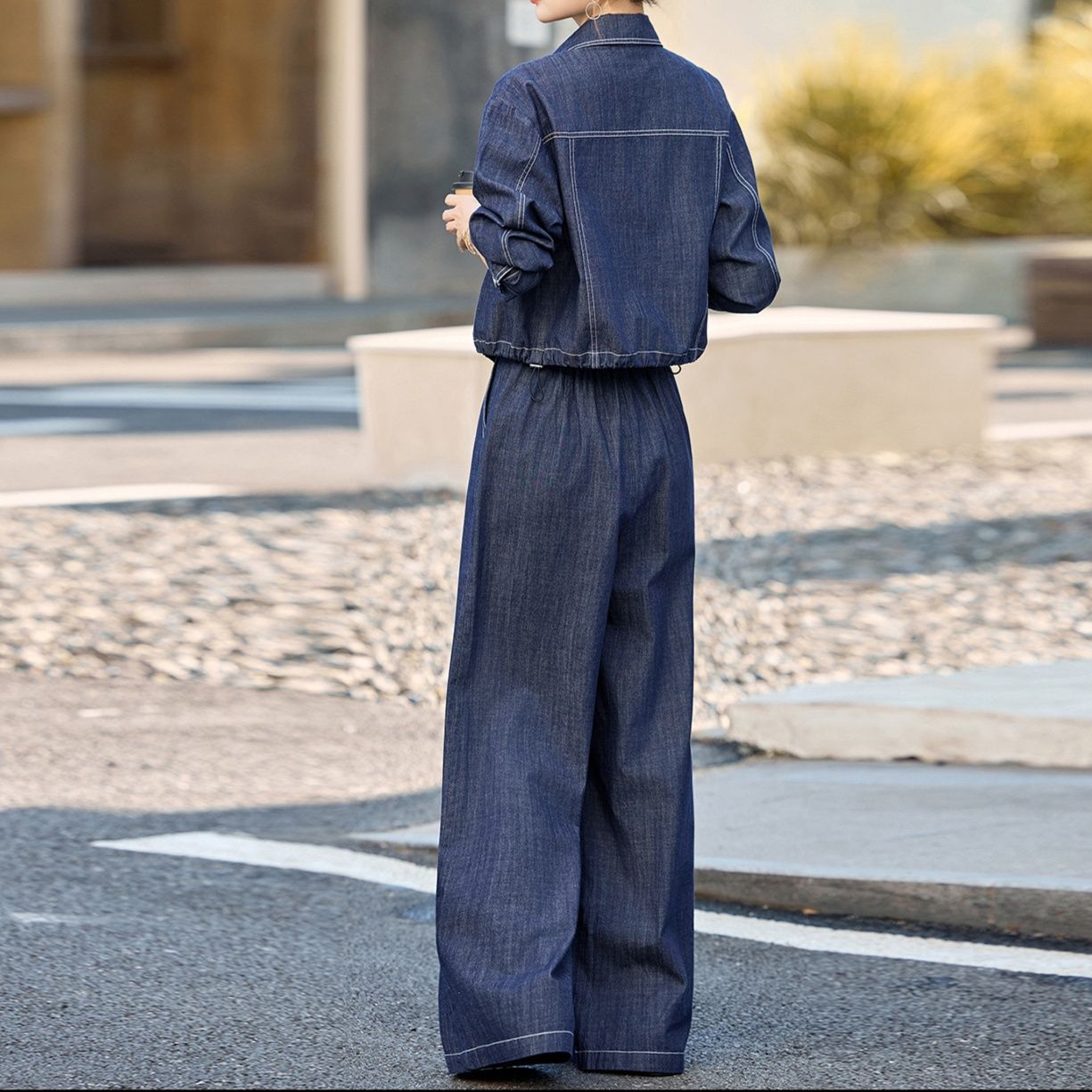 洗練された大人の女性にぴったりなデニムセットアップです。クラシックなジャケットと、エレガントなワイドパンツを組み合わせたスタイリッシュなアイテムです。