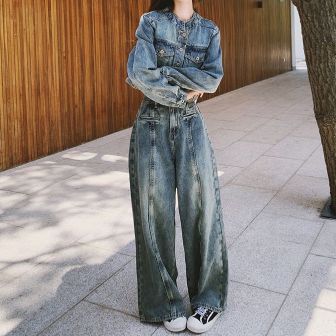 ゆったりとしたシルエットのショートジャケットとワイドパンツの組み合わせで、リラックス感と上品さを両立。