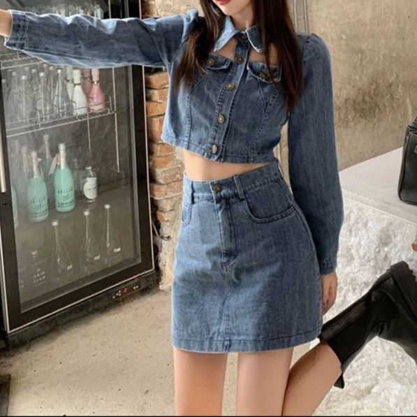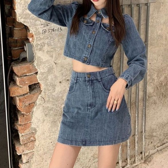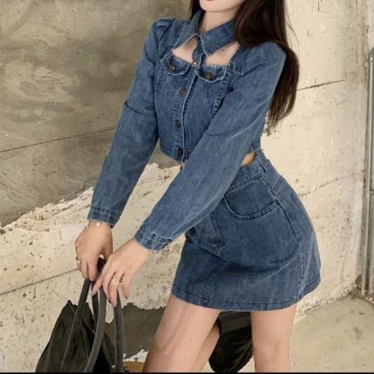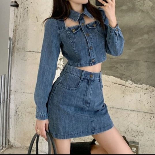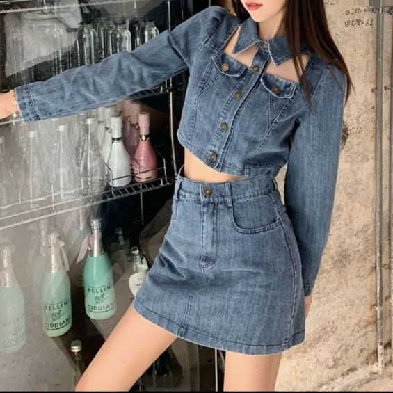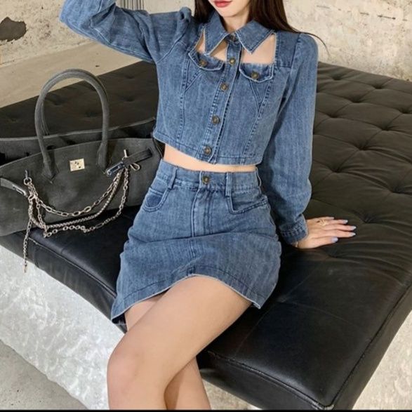胸元に個性的なカットアウトデザインを施した短丈トップスとミニスカートがセットになったデニムセットアップです。