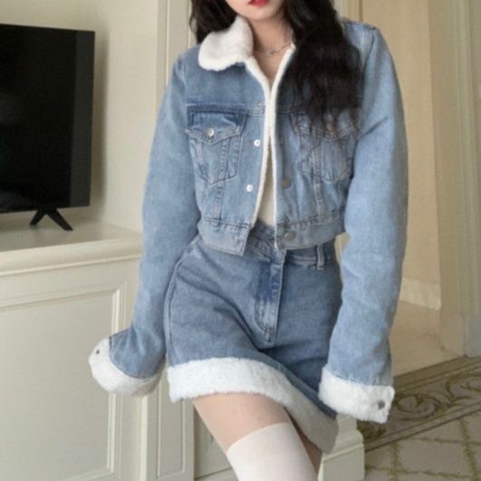 もこもこのボア素材が襟元と袖口にあしらわれたジージャンセットアップで、防寒性と可愛らしさを両立しました。