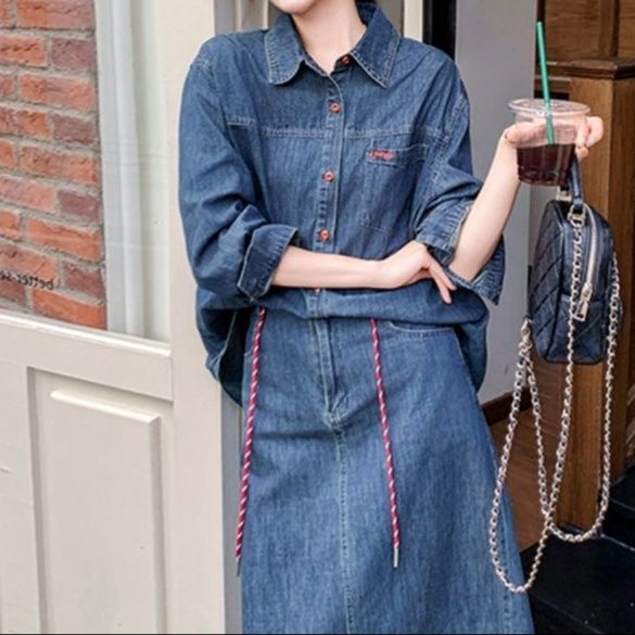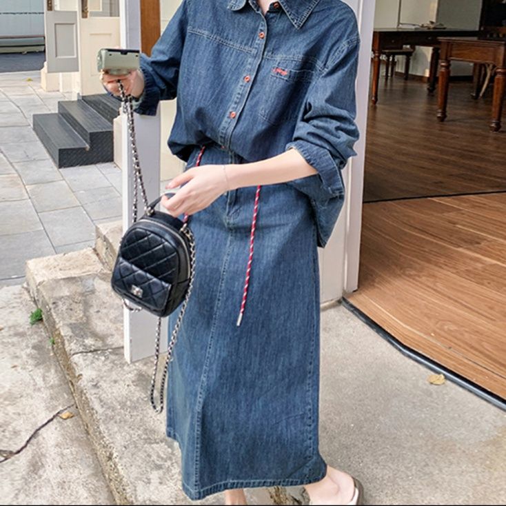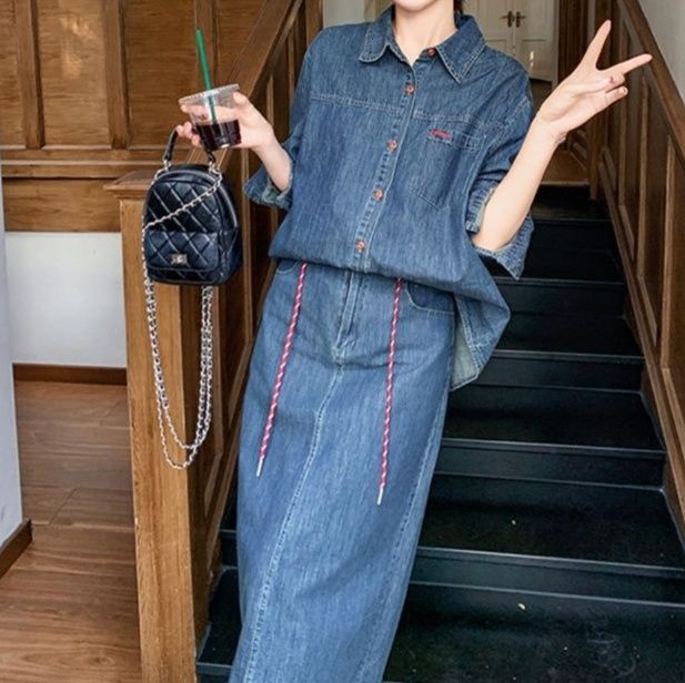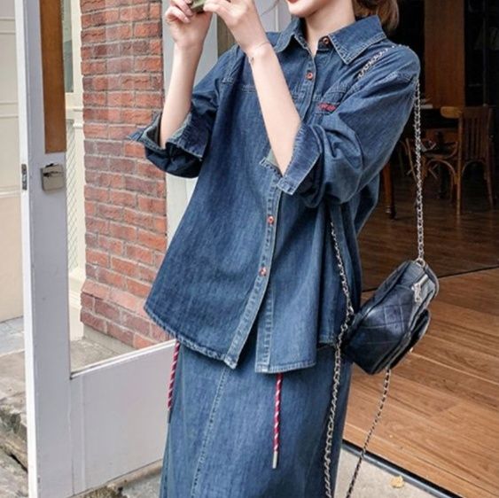 長袖のシャツとミディ丈のタイトスカートの二点セットで、統一感のある着こなしが簡単に完成します。
