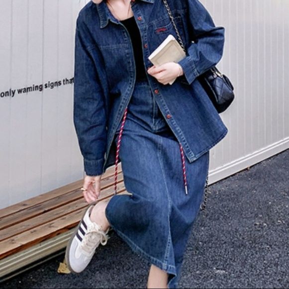 オーバーサイズのシャツとミディ丈スカートで楽な着用感とトレンド感を両立