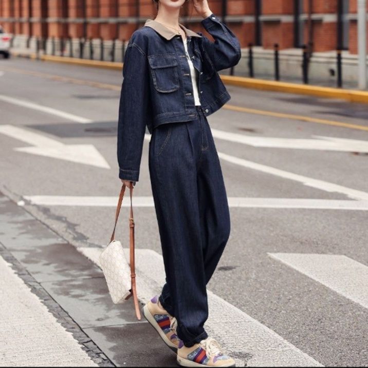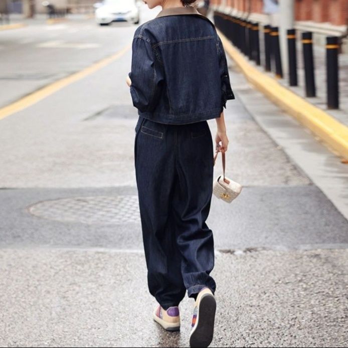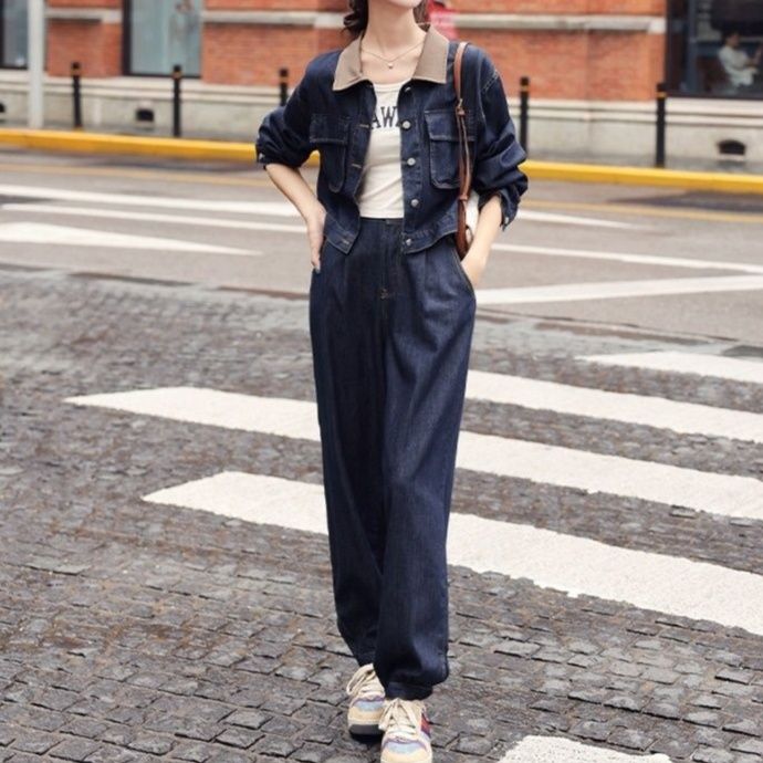 こなれ感のあるデニムセットアップは、ショート丈のジャケットとゆったりとしたワイドパンツの組み合わせが魅力です。