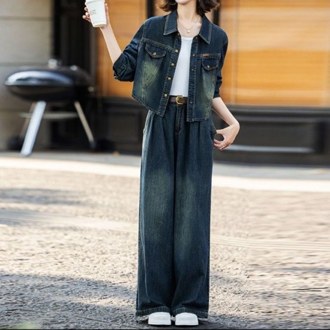 コンパクトなジャケットとゆったりとしたワイドパンツの組み合わせが、バランスの良いシルエットを演出します。