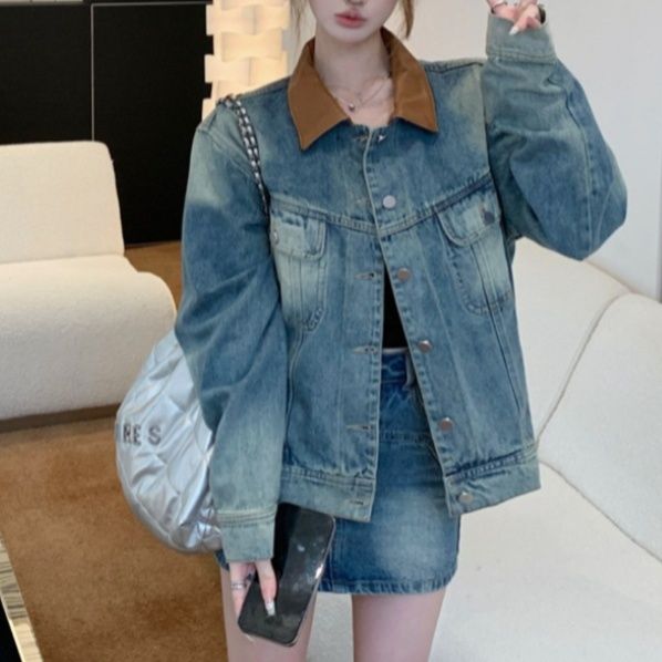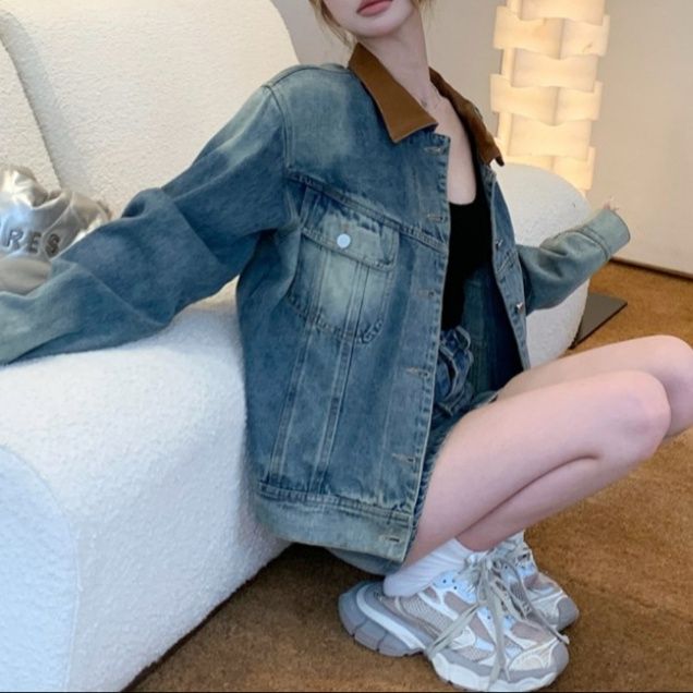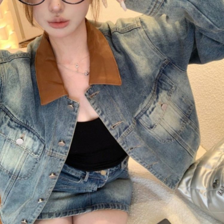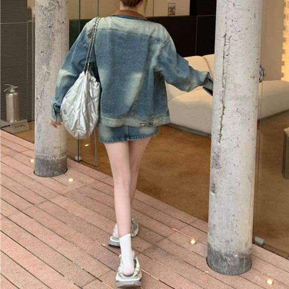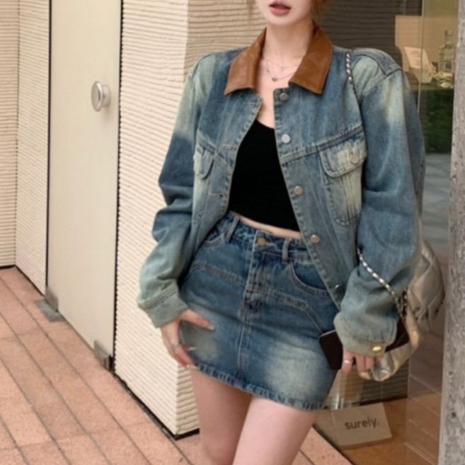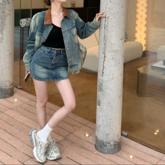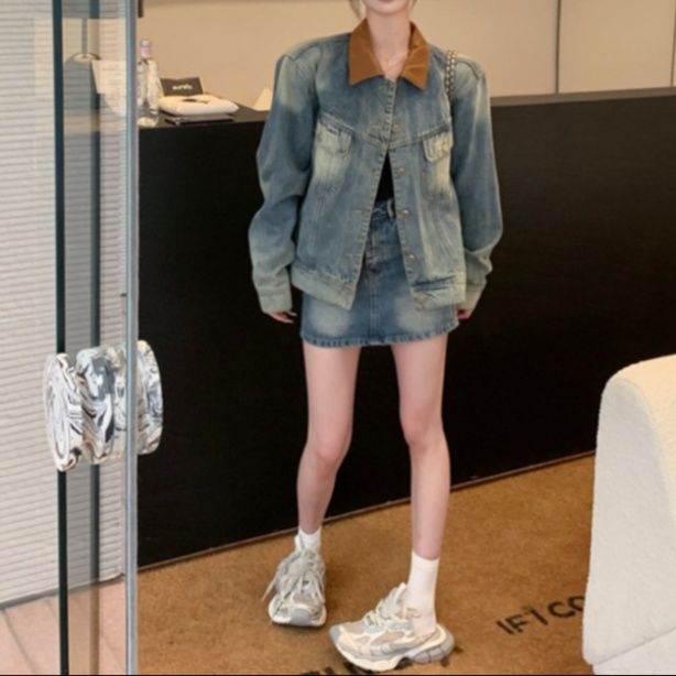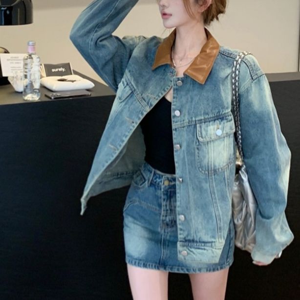 襟部分に異素材の配色デザインを施したジャケットと、ミニ丈スカートの組み合わせが魅力的なデニムセットアップ。