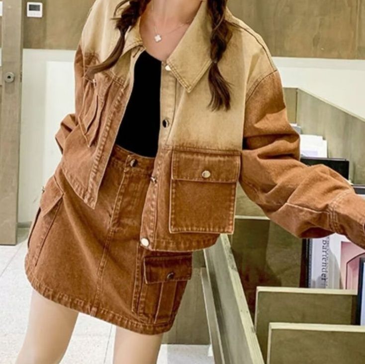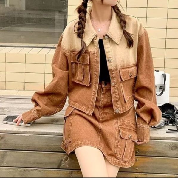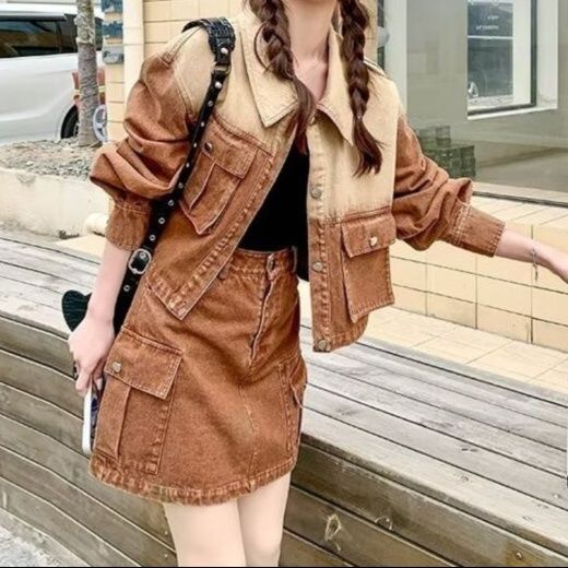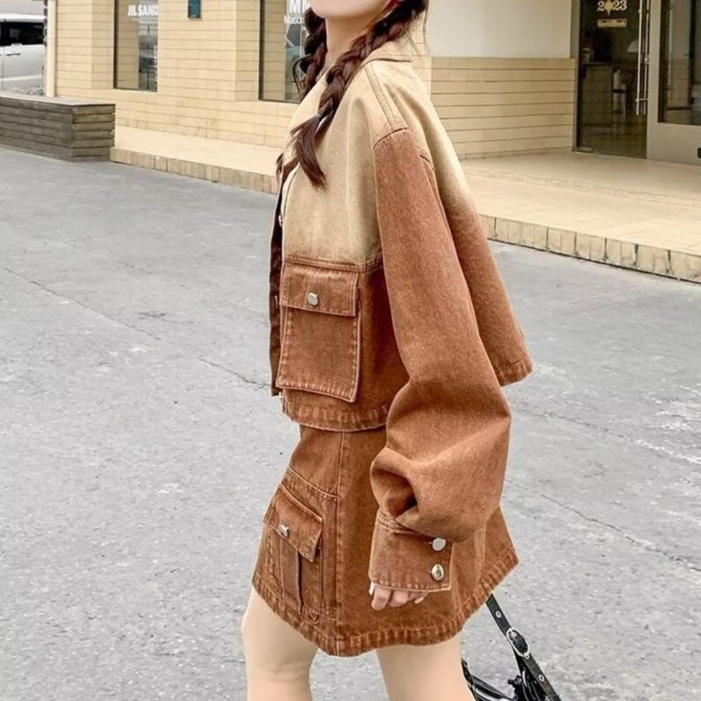 上品なツートーンカラーのジャケットに、機能的なカーゴポケット付きミニスカートを組み合わせた、おしゃれで実用的なデニムセットアップ。