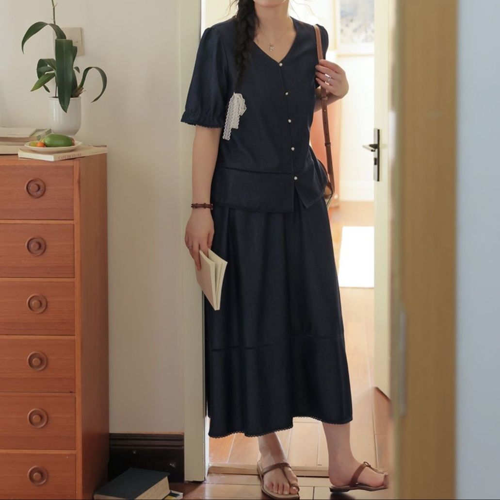 トレンド感のあるデニムセットアップで、パフスリーブが愛らしいトップスとフレアシルエットのロングスカートの組み合わせです。