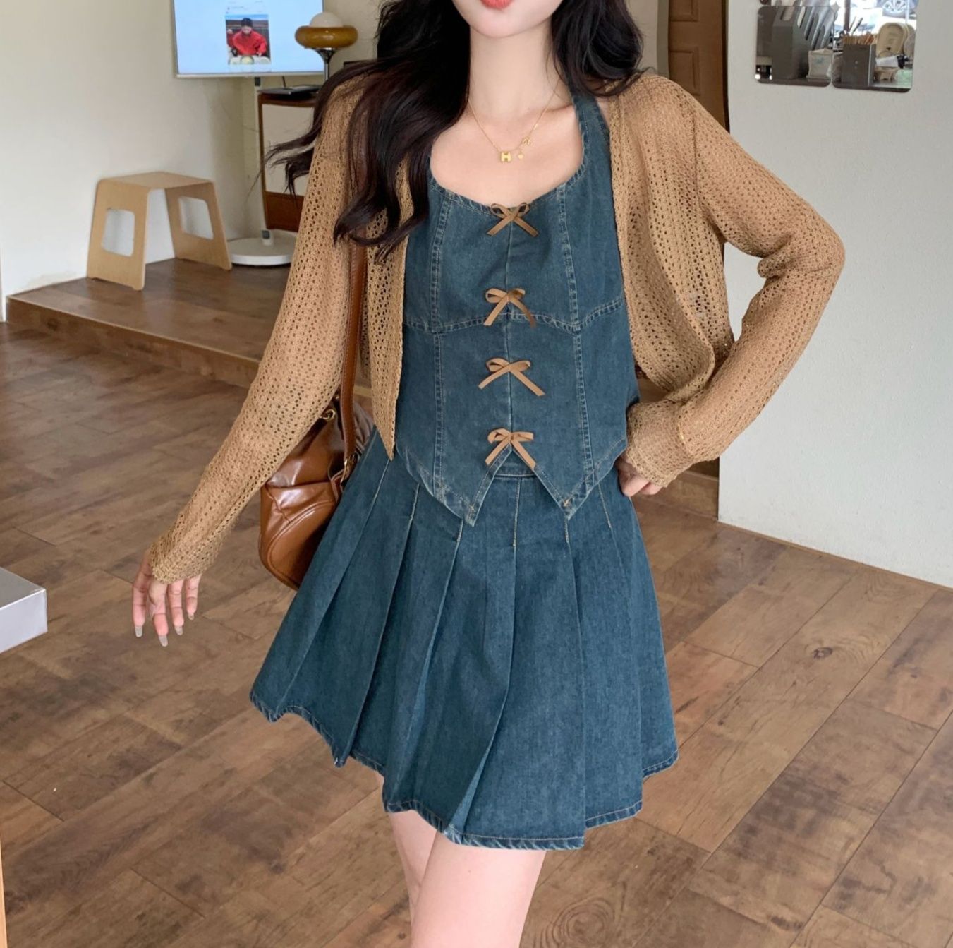 ビスチェ風のトップスとプリーツスカートのデニムセットアップで、カジュアルながらフェミニンな装いが叶います。