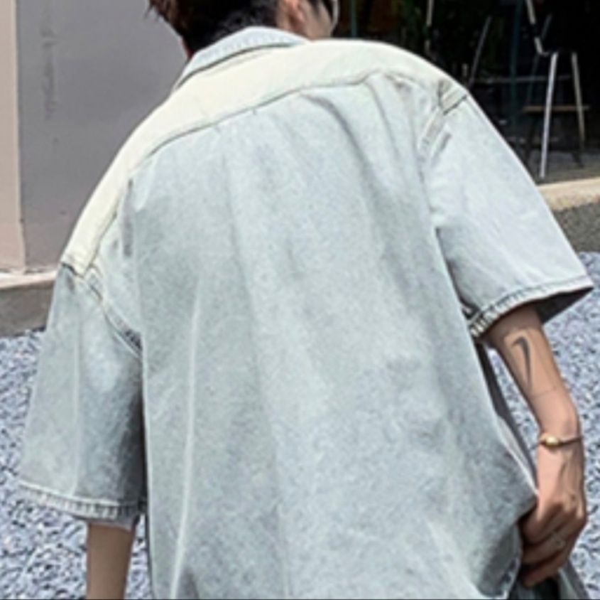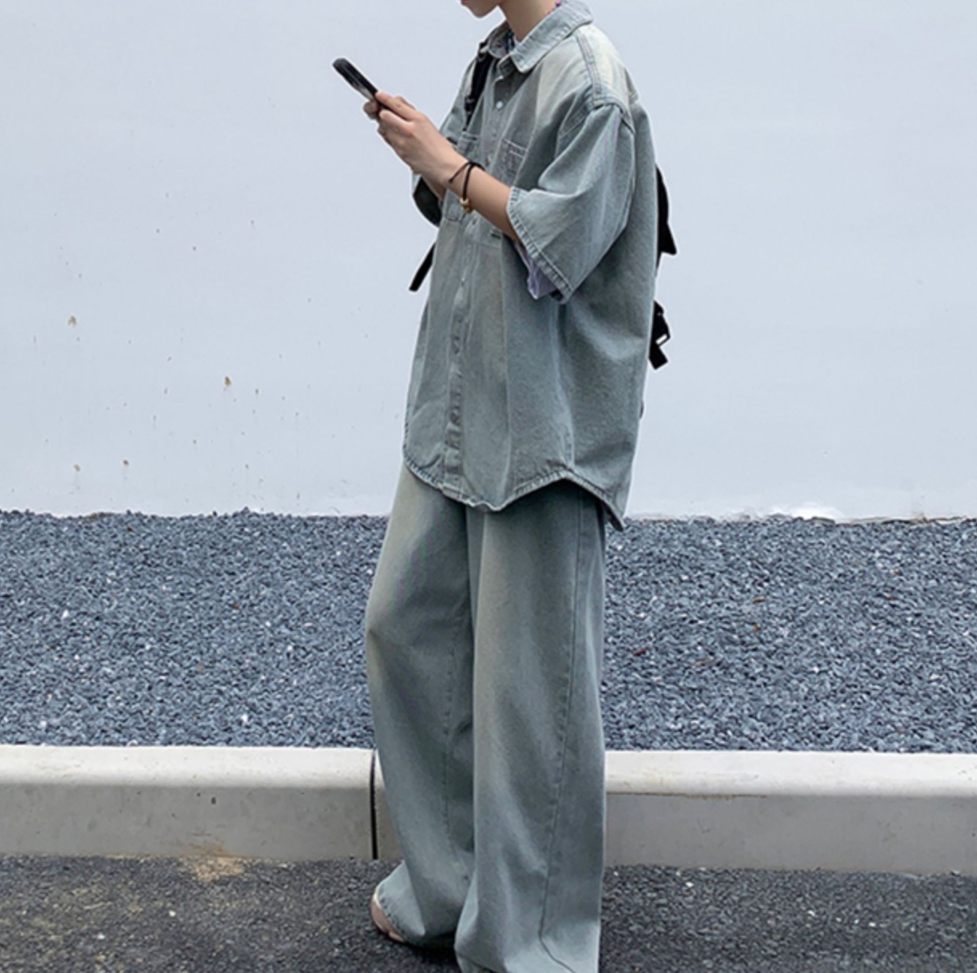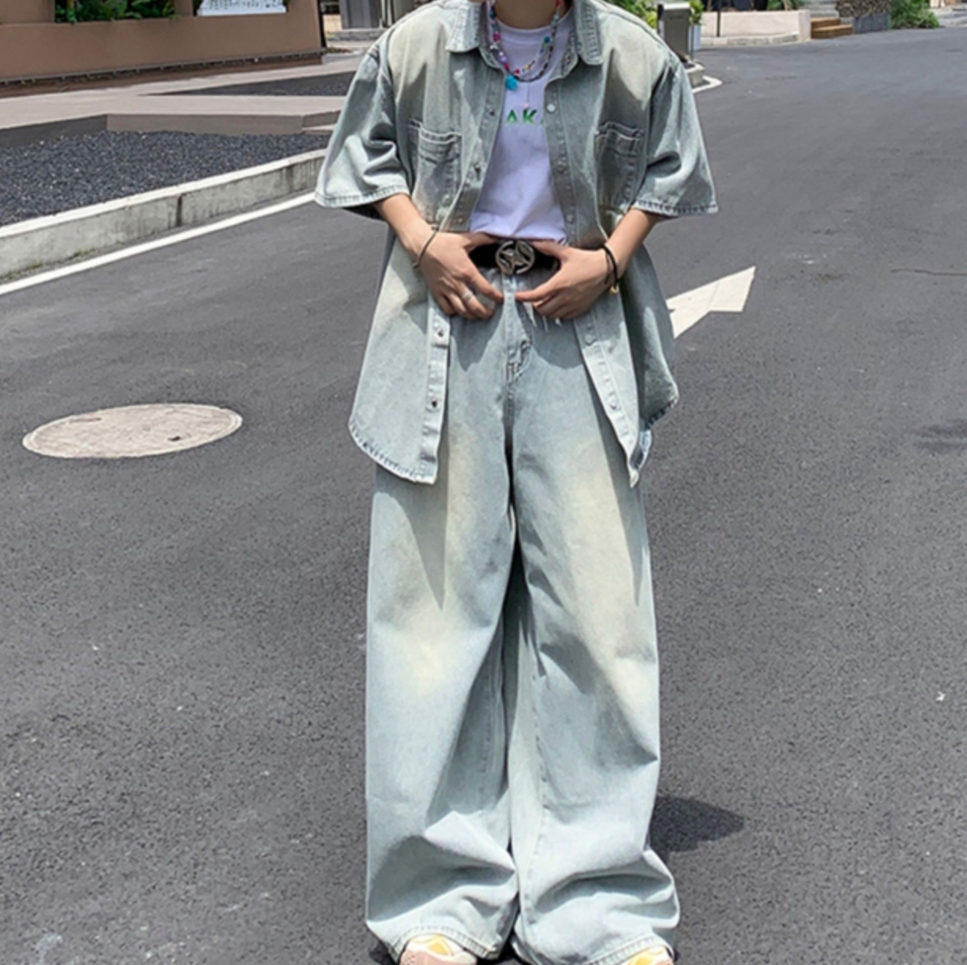 オーバーサイズの半袖デニムシャツとワイドシルエットのパンツを組み合わせた上下セットで、こなれた雰囲気を演出できます。