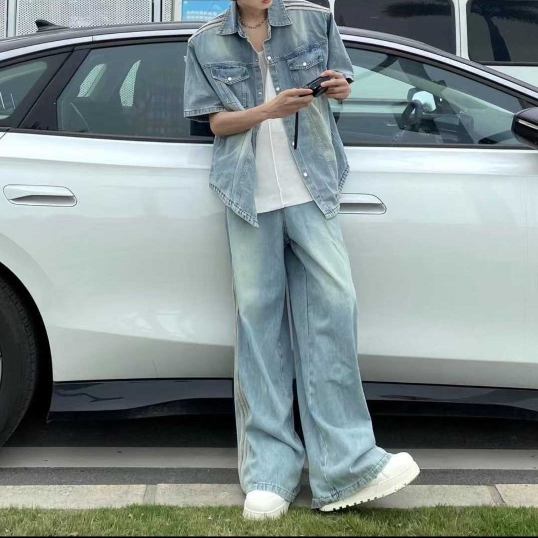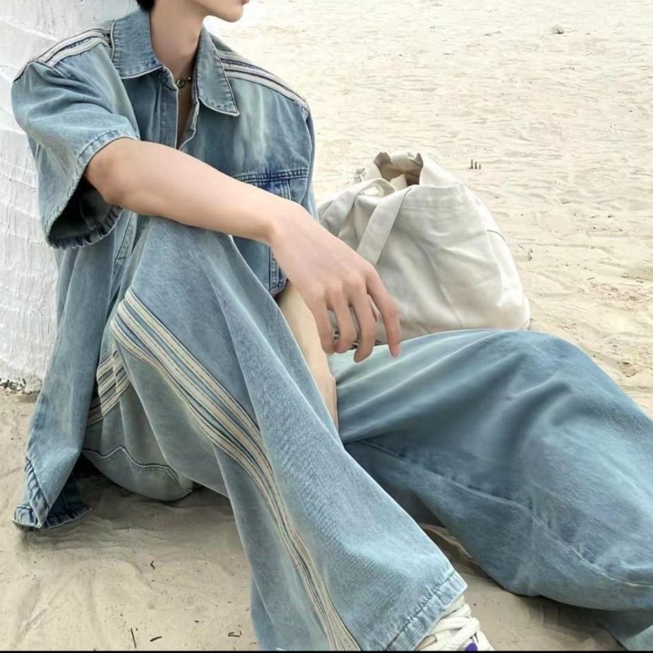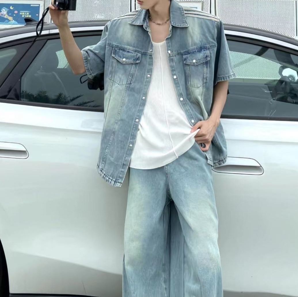 トレンド感溢れるデニムセットアップは、半袖シャツとワイドパンツの組み合わせが魅力的です。