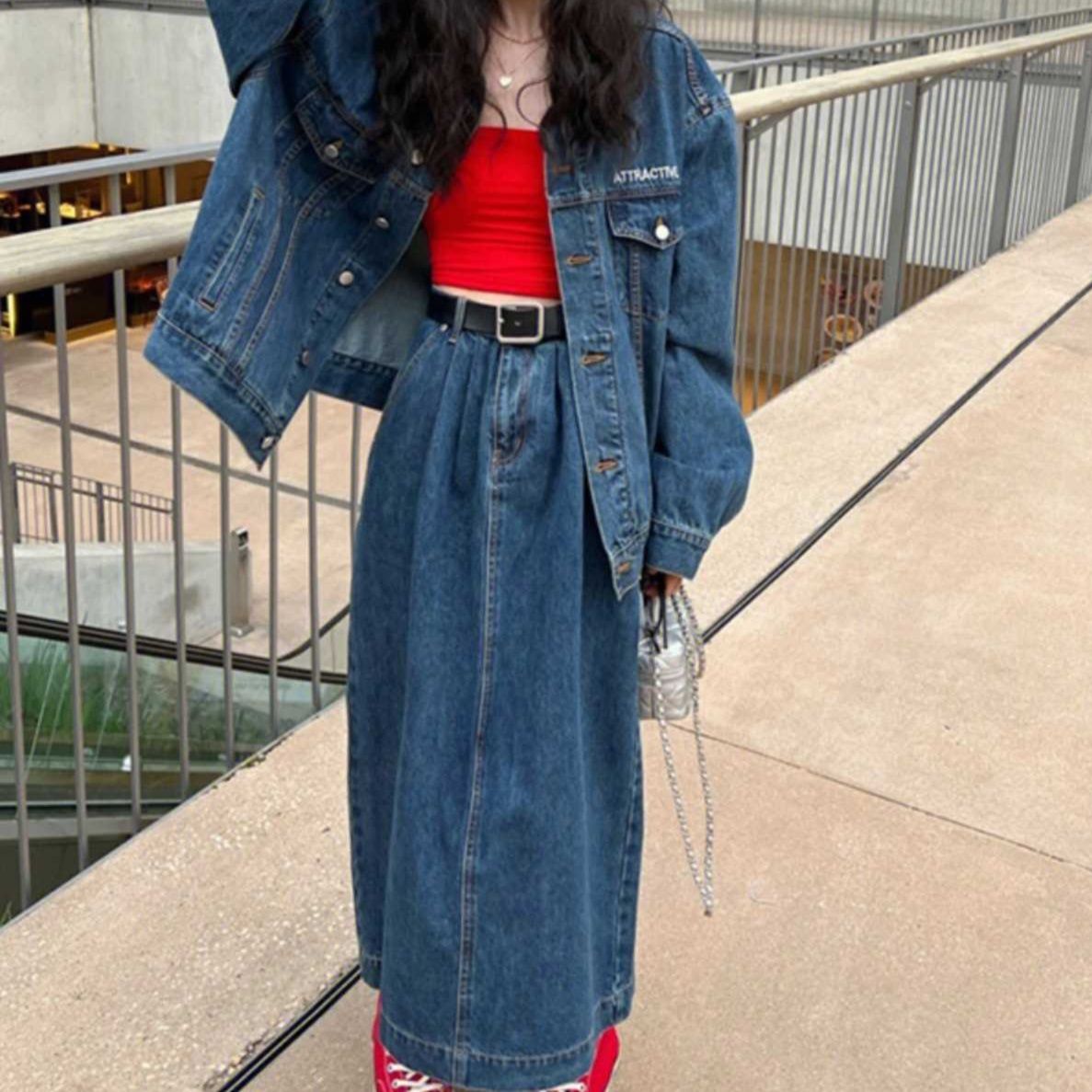 デニムの風合いを活かしながらも、スカートのシルエットで大人っぽい印象に