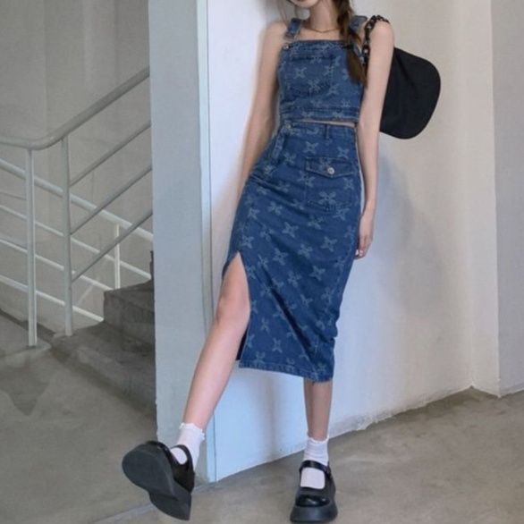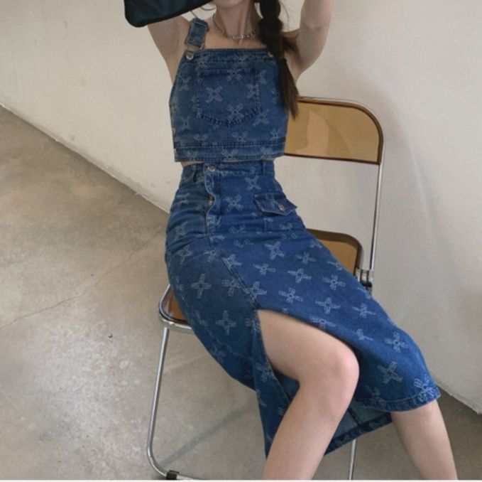 ショート丈のキャミトップスとスカートの組み合わせで、すっきりとした美シルエットを実現