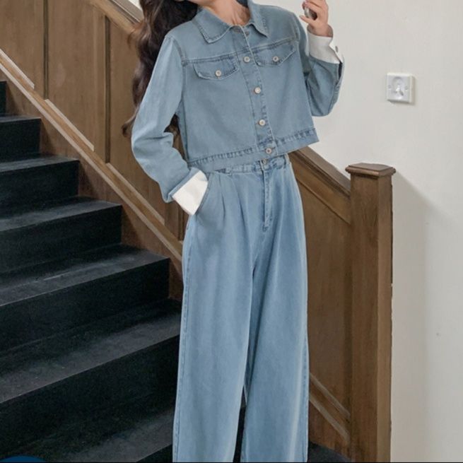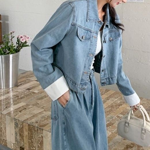 トレンド感のあるジージャンセットアップは、コンパクトなショート丈ジャケットとゆったりワイドパンツの組み合わせが魅力です。