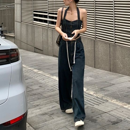 前ボタン仕様のビスチェトップスとドローコード付きワイドパンツの組み合わせが特徴です。