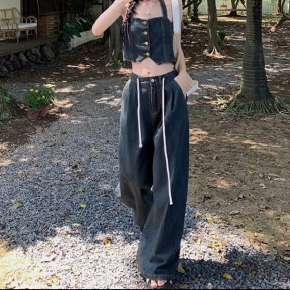 フロントボタンがアクセントのショート丈ビスチェと、紐付きのゆったりワイドパンツを組み合わせたデニムセットアップです。