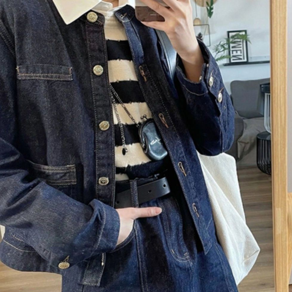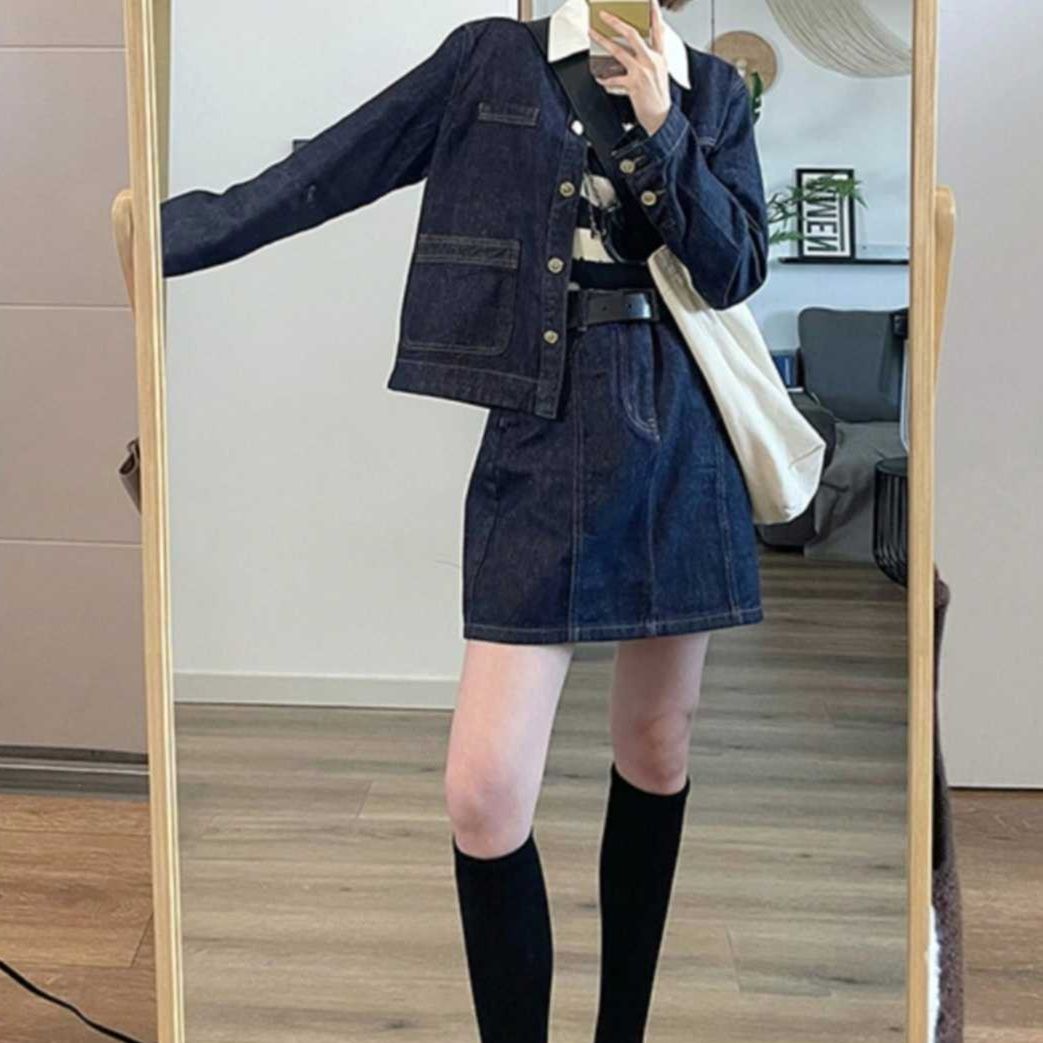 カジュアルなデニムセットアップは、ショート丈ジャケットと台形ミニスカートの組み合わせが魅力的です。
