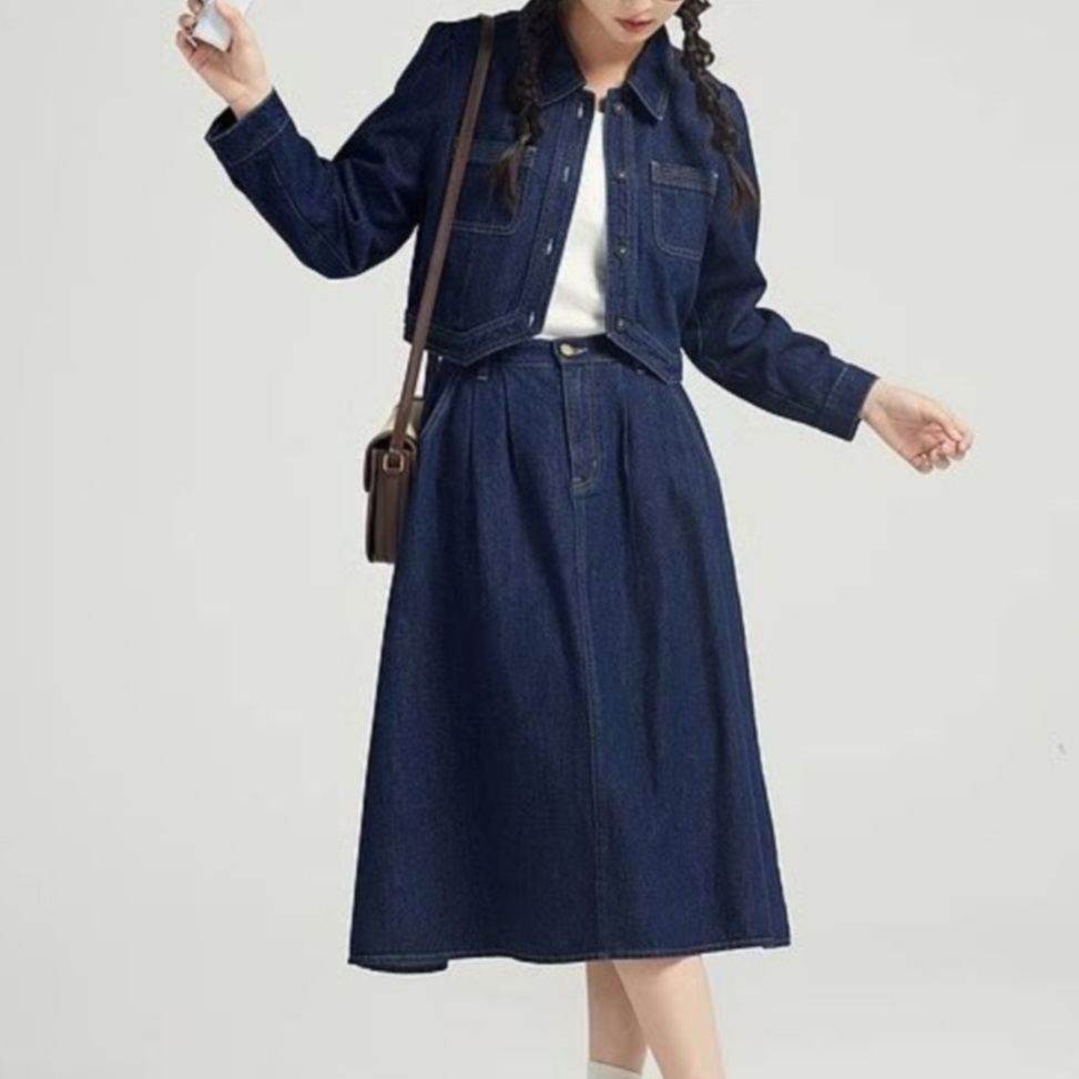 ジャケットとスカートの組み合わせが上品で懐かしさを感じさせる雰囲気を演出