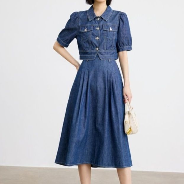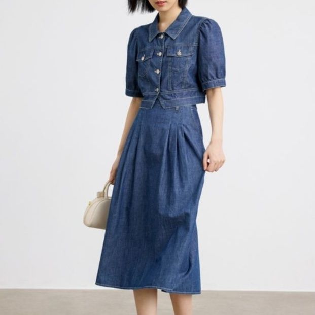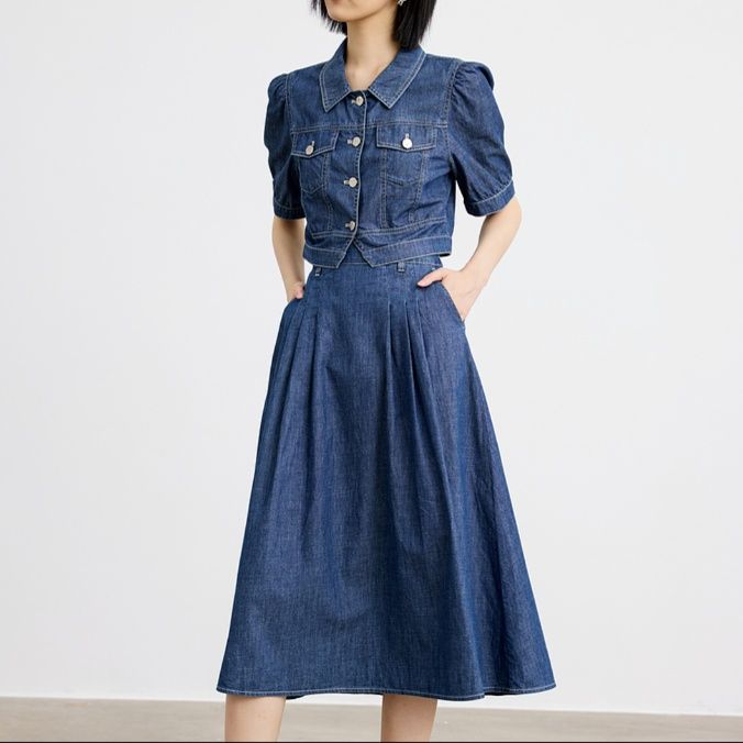 上品な広がりのあるシルエットで、デニム素材でありながら優雅な雰囲気を醸成