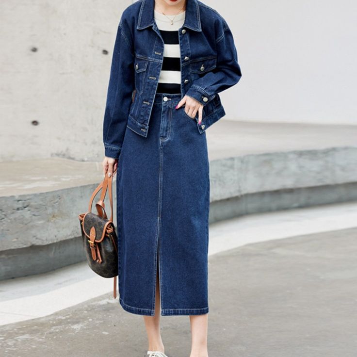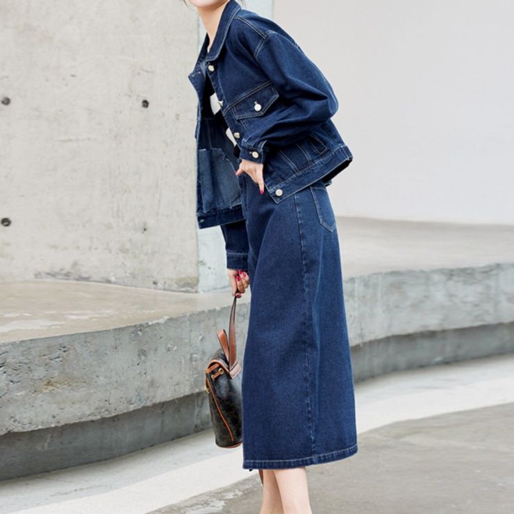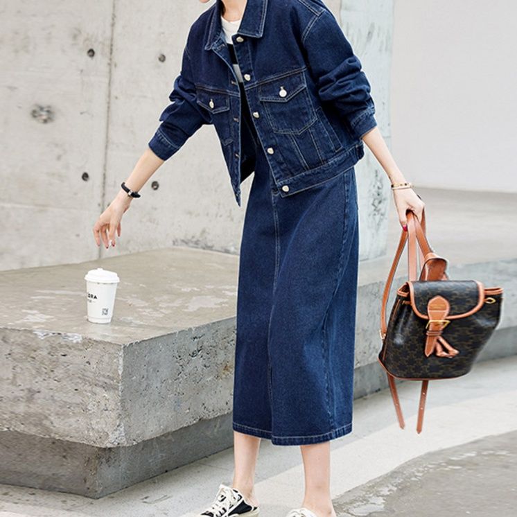 上質なデニム生地を使用したジャケットとスカートの組み合わせで、カジュアルながら洗練された印象に