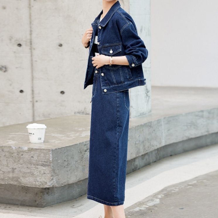 カジュアルで上品なデニムセットアップは、ジャケットとミディスカートの二点セット商品です。