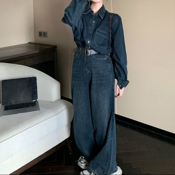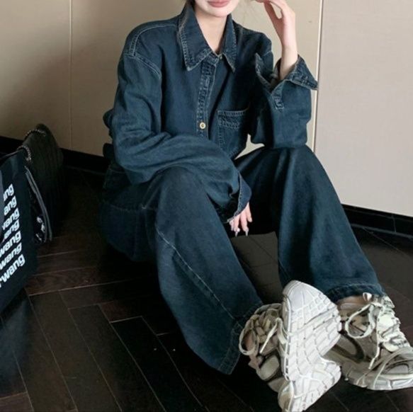 デニム素材のシャツとワイドパンツを組み合わせたデニムセットアップで、こなれ感のあるスタイリングが完成します。