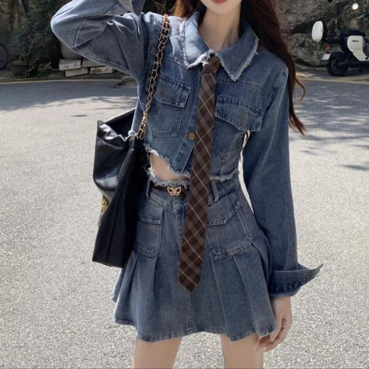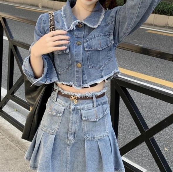 トレンド感あふれるデニムセットアップは、クロップド丈ジャケットとプリーツミニスカートの組み合わせが魅力的です。
